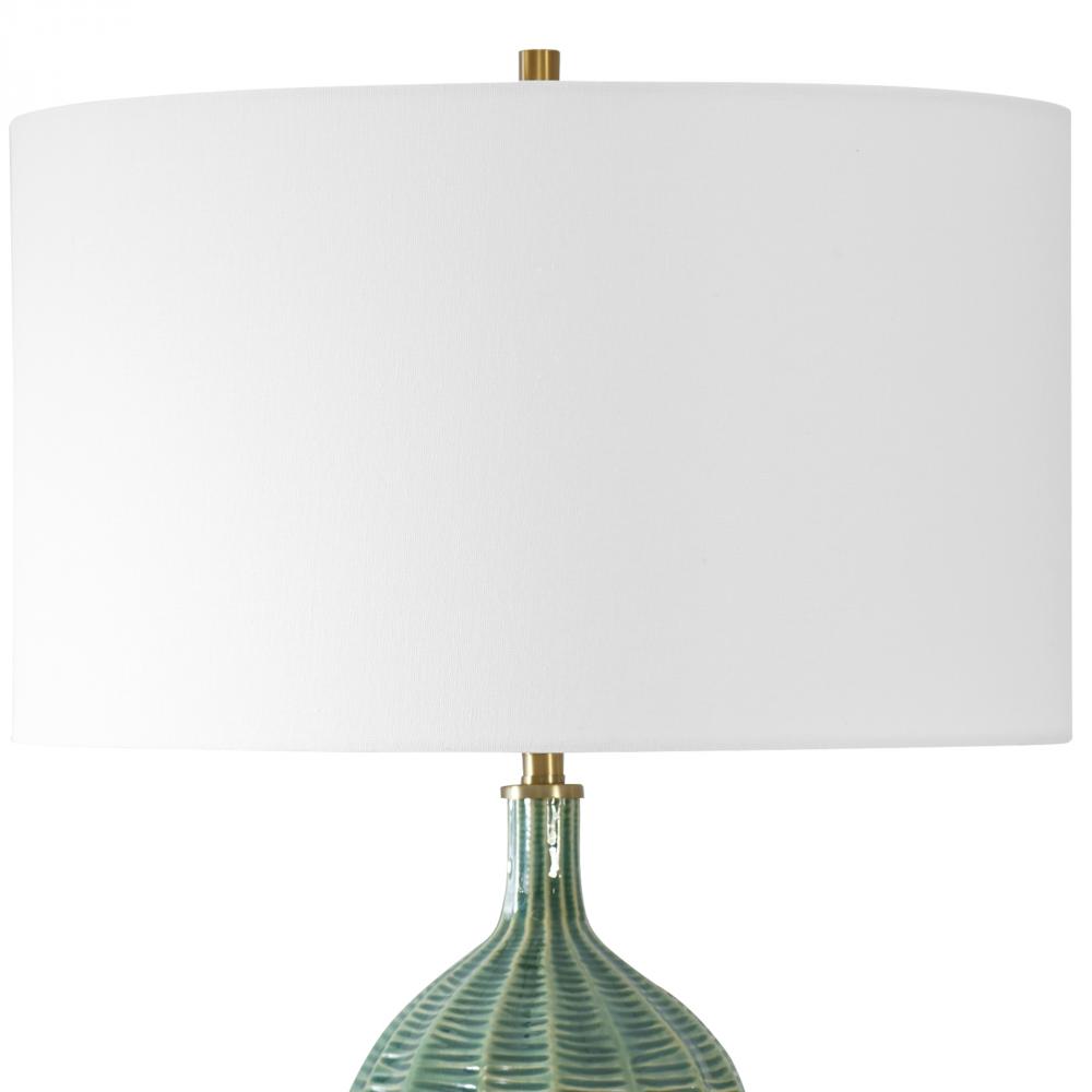 Crafted With A Ceramic Base Featuring Scalloped Channels And An Organic Striped Texture, All Bathed In A Luxurious Hunter Green Glaze. Enhanced With Plated Antique Brass Finishes. The Round Drum Shade Is Covered In A Crisp White Linen Fabric.