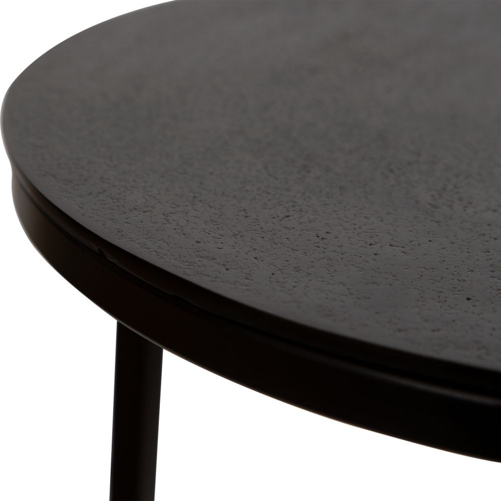 Modern and Streamlined, This Round Accent Table is Constructed in An Aged Black Iron Featuring A Cast Textured Aluminum Slab Top Finished in A Plated Antique Bronze.