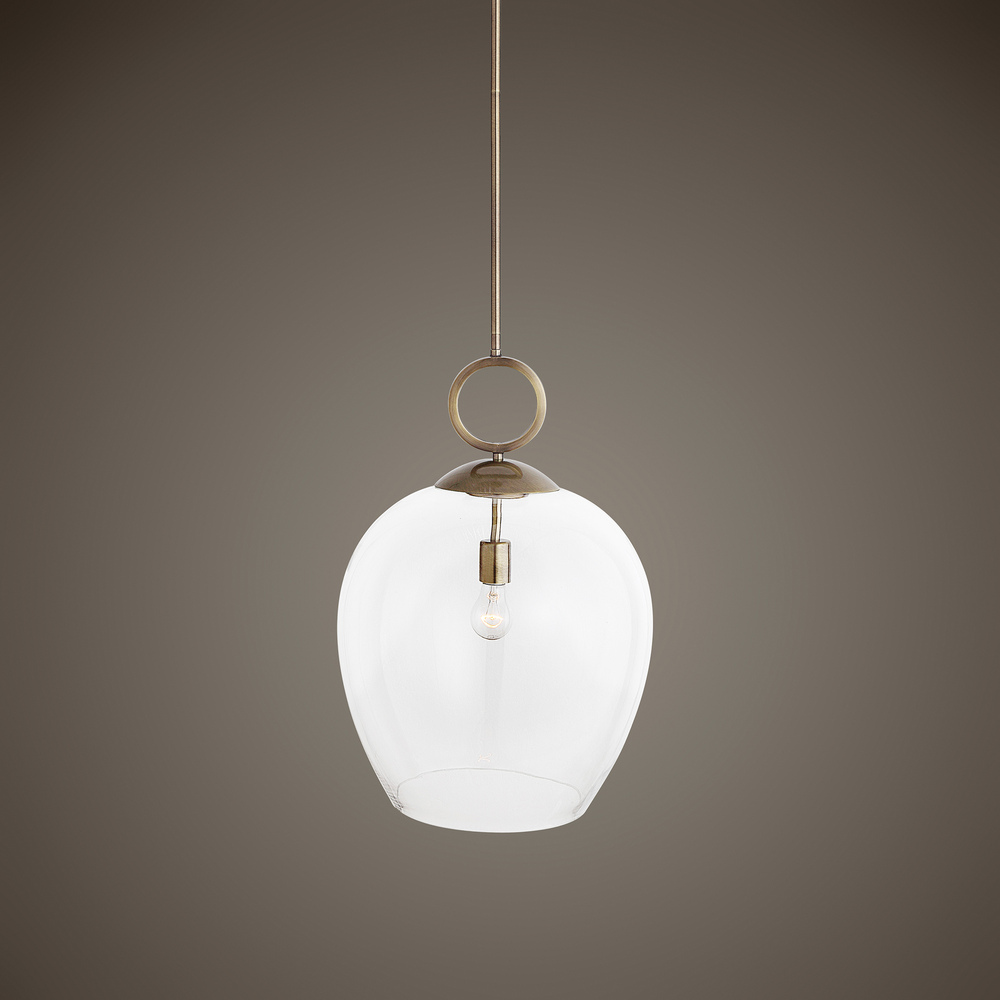 Simple Elegance Best Describes The Extra-large Clear Blown Glass on This Transitional Pendant. Calix Features An Aged Brass Metal Finish Which Has An Ombre Effect Giving A Deeper Hue of Antique Darkening to Some Areas and Brightening on Others. The Large Circle Accent Above The Glass Adds A Bold Graphic Element. 1-100 Watt Max, Edison Socket. Bulbs Not Included. Supplied with 15' Wire, and 3-12" Stems & 1-6" Stem for Adjustable Installation.