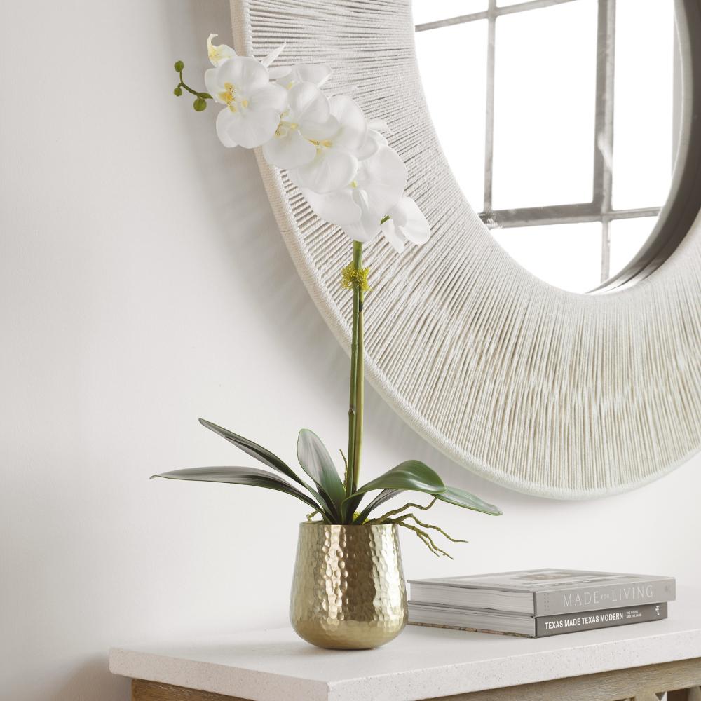 A Gracefully Arching Stem of White Orchids with Reindeer Moss Accents Over A Bed of Naturally Preserved Moss, Placed in A Contemporary Hammered Brass Metal Pot. Container is 4.5" W X 4.5" H X 4.5" D.