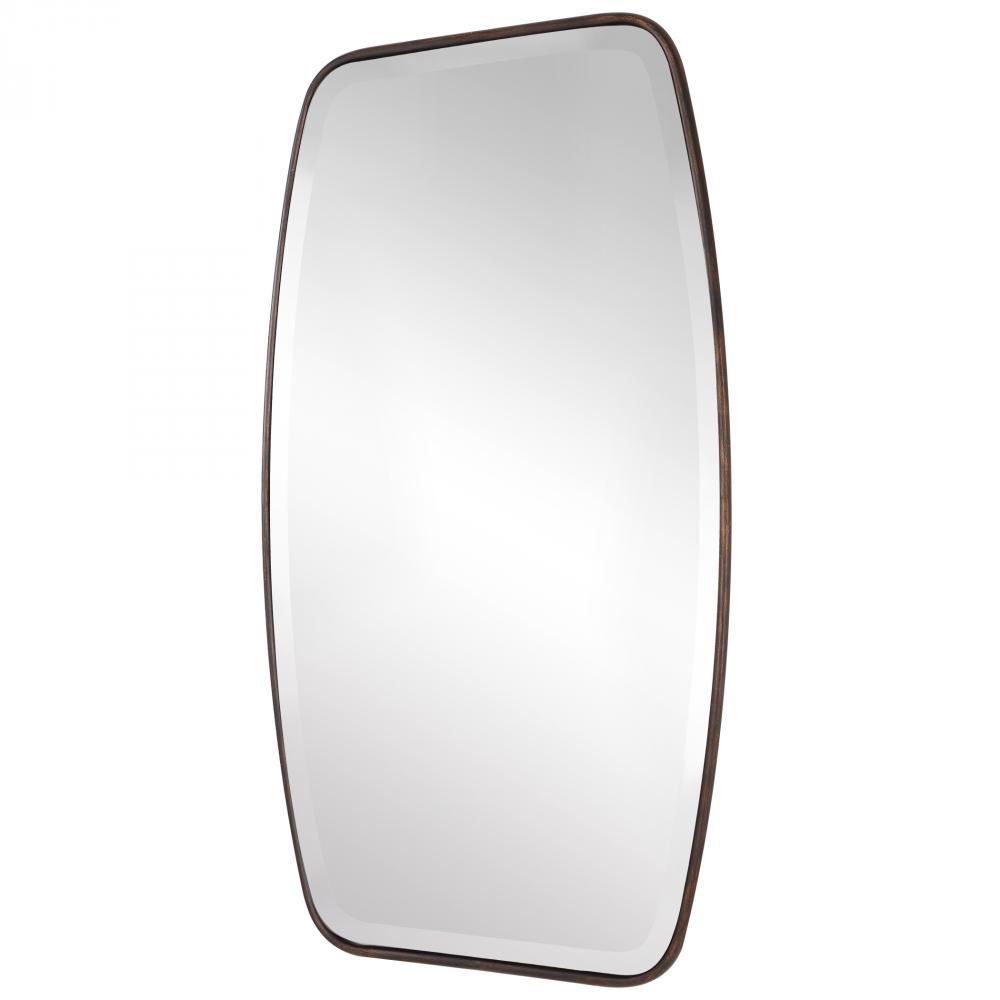 This Shaped Mirror Frame is Forged From Rounded Metal Finished in A Lightly Distressed Dark Bronze, Featuring A Floating Beveled Mirror. May Be Hung Horizontal or Vertical.