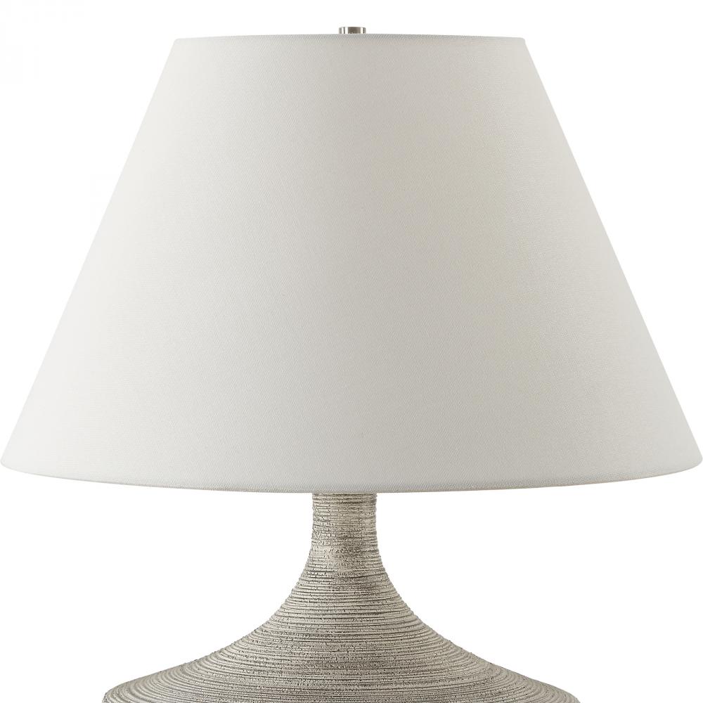 Where Vintage Charm Meets Contemporary Design, The Carafe Table Lamp Features A Charcoal Ceramic Base With Stone Ivory Ribbed Overlay And Heavy Distressing. Enhanced With Brushed Nickel Plated Details, This Lamp Adds A Touch Of Modern Refinement To Any Space. The Round Hardback Shade Is Covered In A Light Beige Linen Fabric.