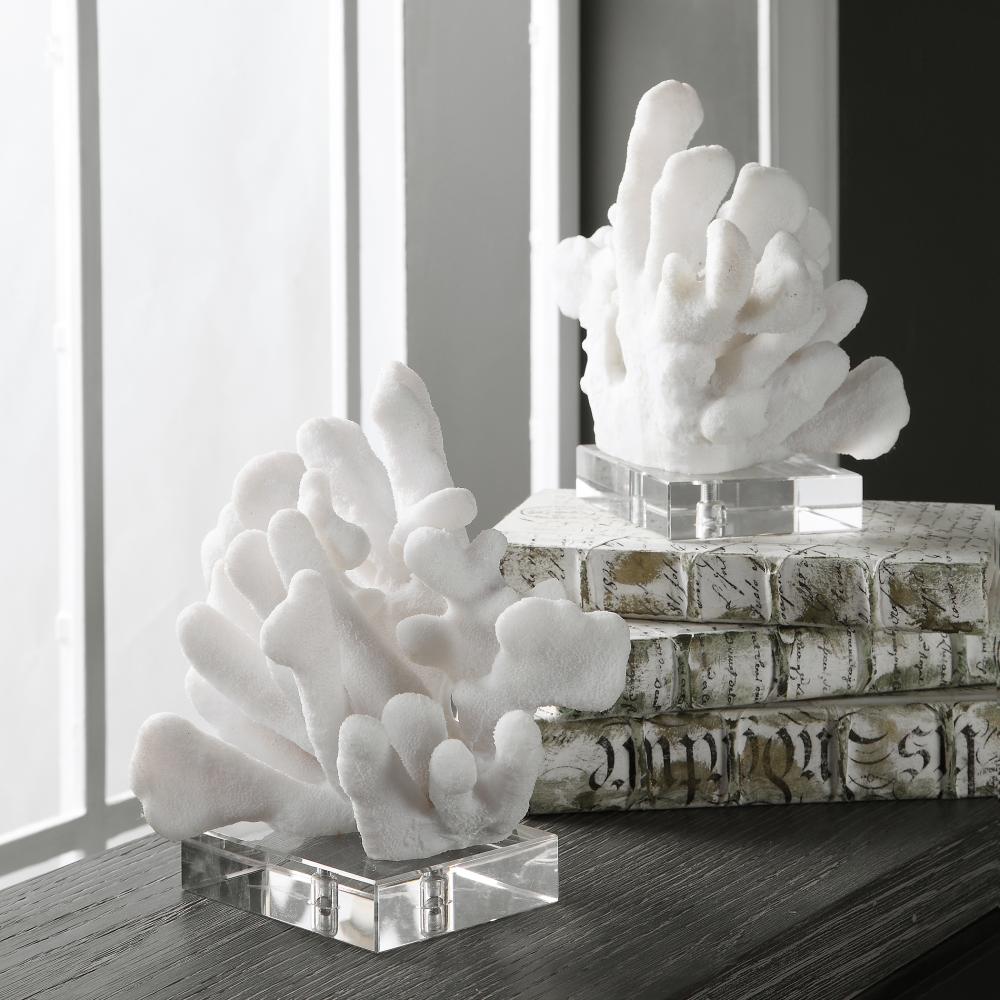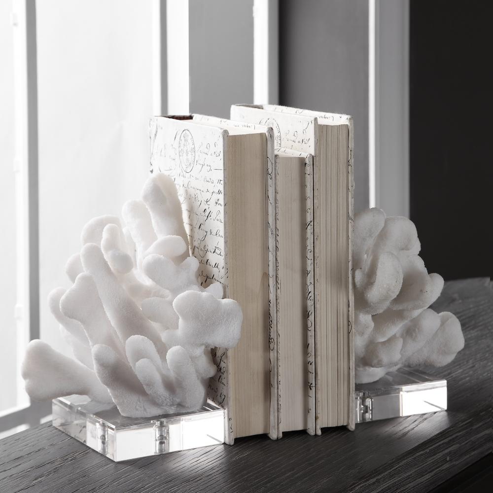 Set of Two Bookends Featuring Textured Faux White Coral on Crystal Bases. Sizes: S-5x9x8, L-6x9x8