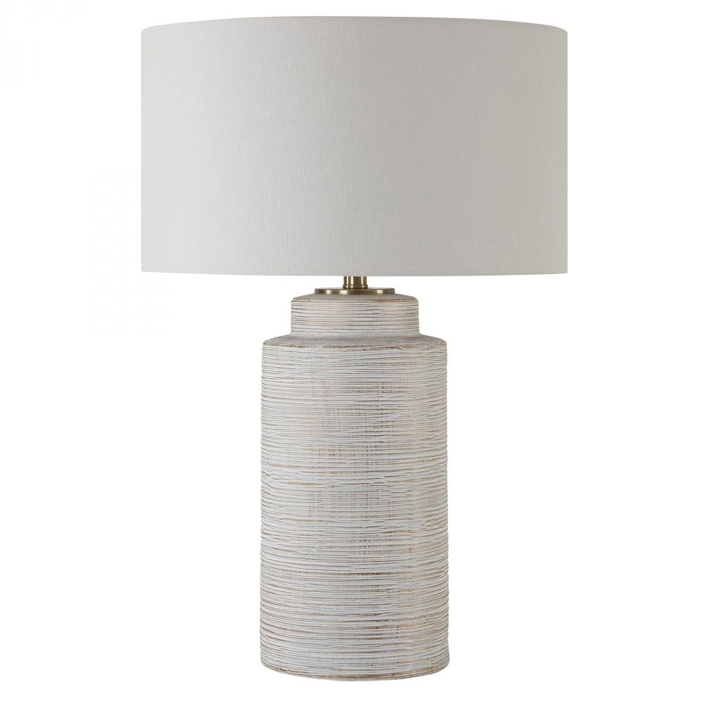 This Ceramic Table Lamp Features Heavy Ribbed Texture Finished In A Heavily Distressed Ivory Glaze With Gold Leaf Undertones, Accented With Plated Brass Details. A Round Hardback Drum Shade Finished In A Casual White Linen Fabric Completes The Piece.