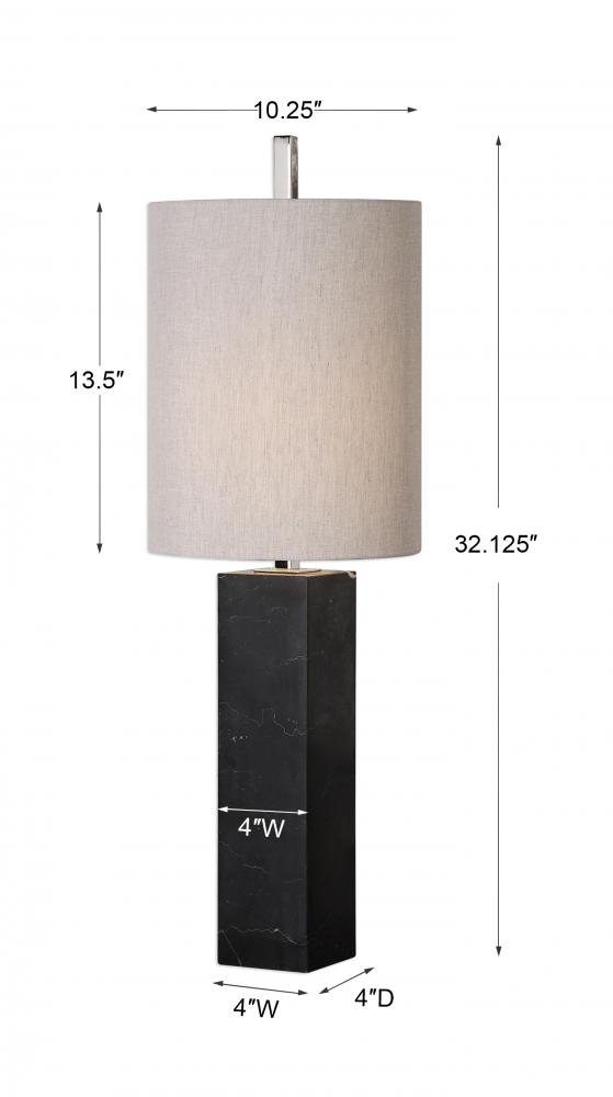 Chunky, Black Marble Column with Subtle White Veining, Accented with Polished Nickel Plated Details. The Tall Round Hardback Shade is A Light Beige Linen Fabric.