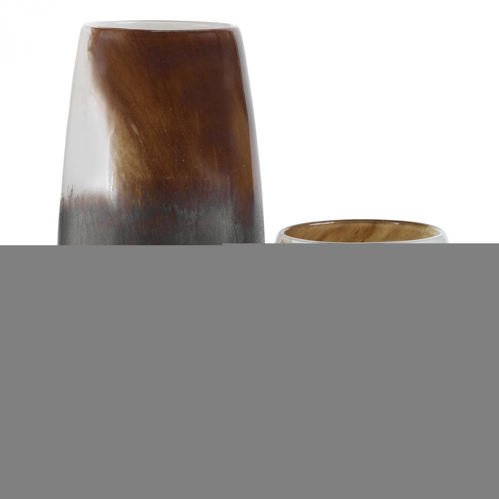 Handcrafted From Glass, This Set of Vases Showcases A Unique Blend of Warm Neutral Tones From Light Sand to Rust and Dark Bronze. Display on Their Own or Paired with Fresh Flowers or Candles. Sizes: S-7x8x7, L-7x12x7