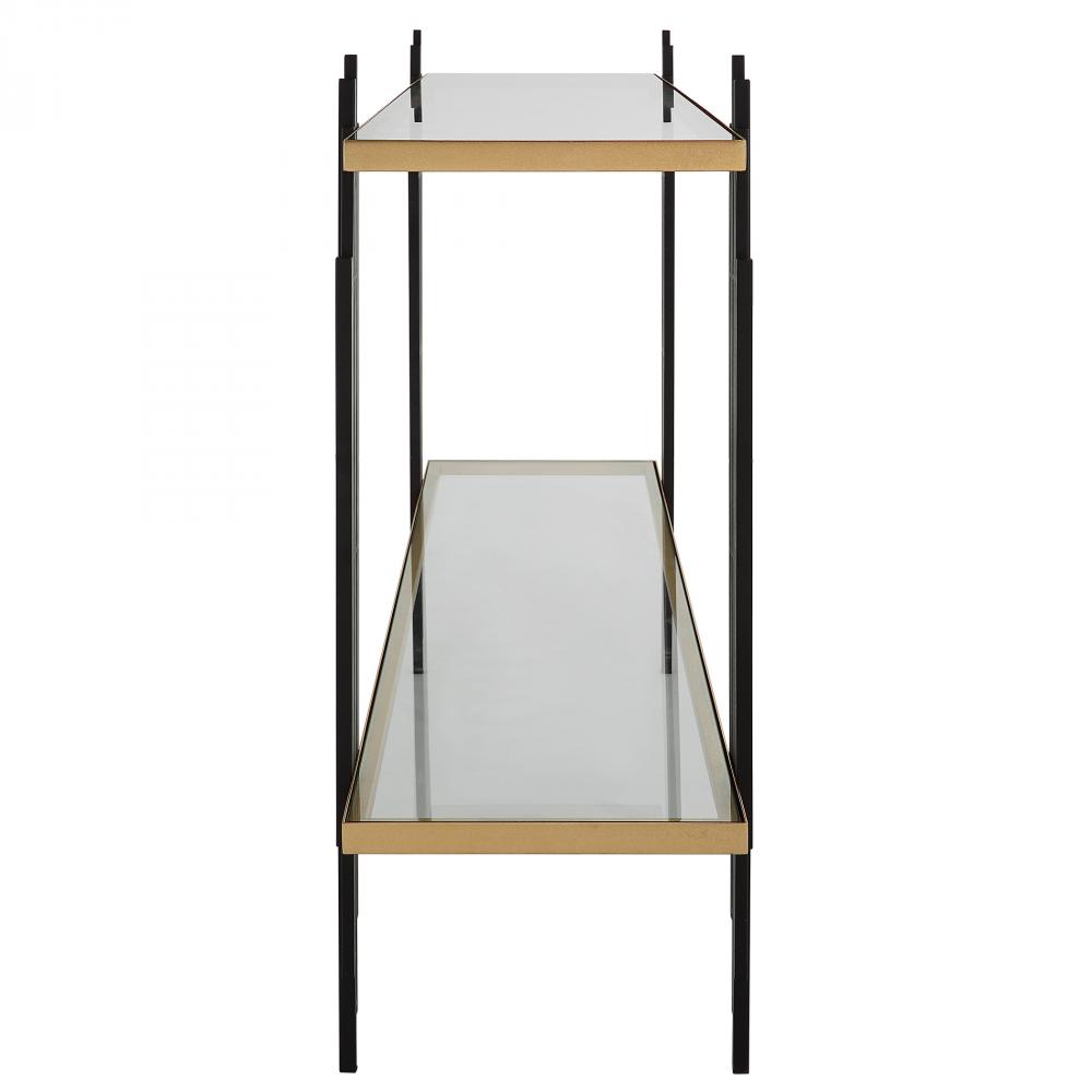 Gold Leaf Shelves Seem to Float Between Matte Black Iron Legs Reminiscent of A Cityscape. Two Shelves Are Clear Tempered Glass.