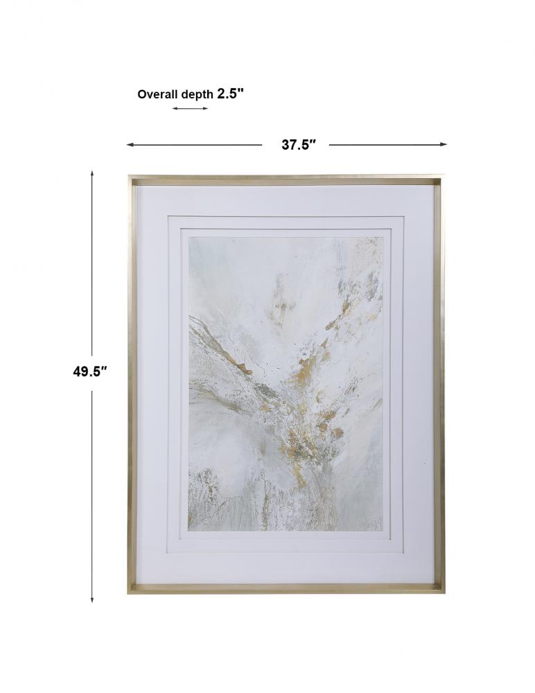 Create An Elegant Statement with This Feminine Abstract Print. The Neutral Artwork Features Shades of Light Gray, White, and Gold Leaf. Triple White Matting and A Warm Silver Leaf Frame Complete This Sophisticated Piece. Print is Placed Under Glass. Artwork By Jennifer Gardner.