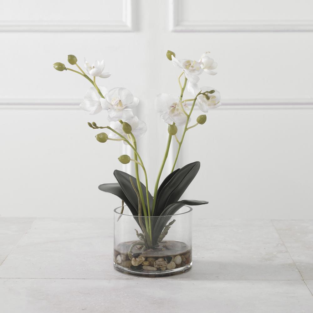 Symbolic of Faith and Beauty, This White Orchid Adds An Elegant Touch to Any Tabletop. The Plant is Placed in A Clear Glass Container with Faux Water and Natural River Stones.