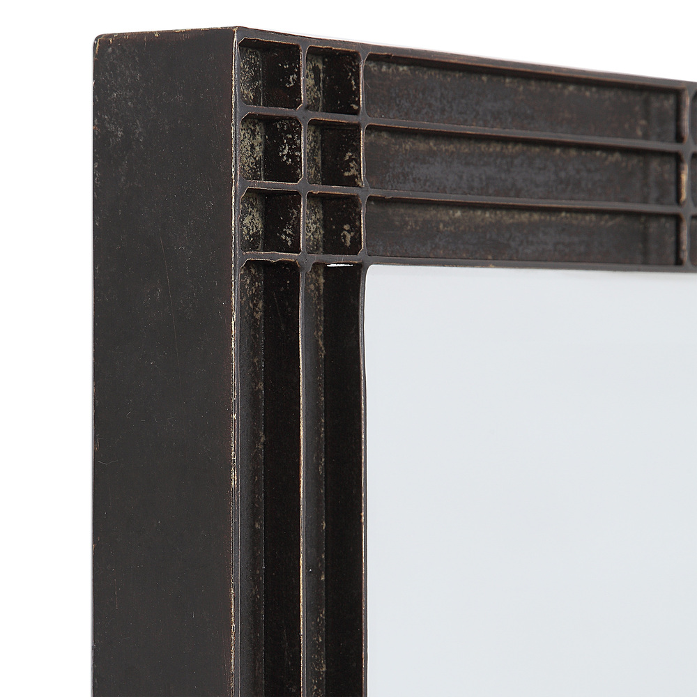 Crafted From Hand Forged Iron, This Rectangular Mirror Features Raised Geometric Detailing Finished in A Rustic Aged Black with Subtle Silver Highlights and A Gray Patina Wash. The Mirror is Surrounded By A Generous 1 1/4" Bevel and May Be Hung Horizontal or Vertical.