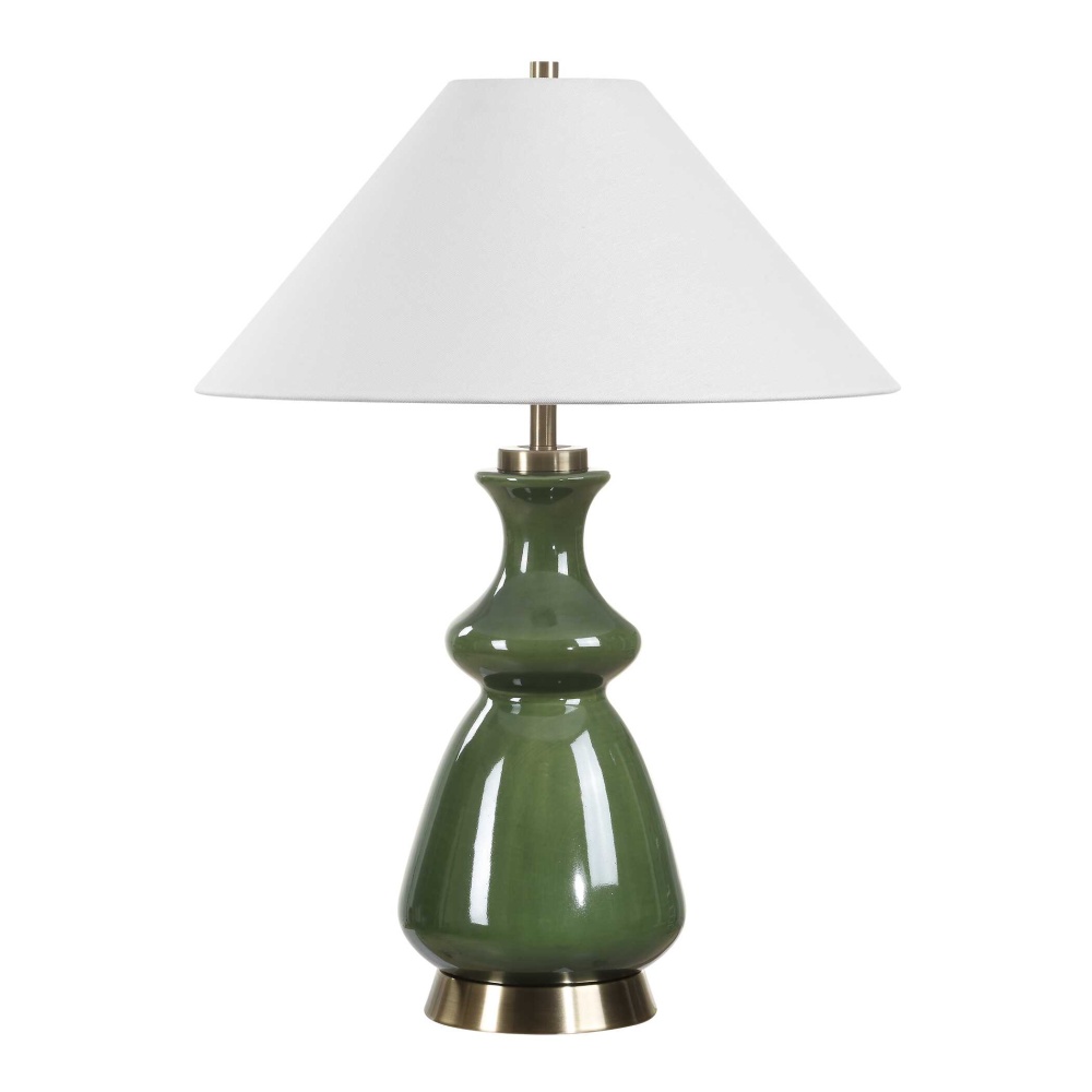 The Green Thumb Table Lamp Offers Both Versatility And Sophisticated Style. The Moss Green Ceramic Base Adds A Subtle Pop Of Color, Making It A Perfect Accent Piece, Accented With Light Brass Plated Details. The Round Coolie Shade Is Covered In A Crisp White Linen Fabric.