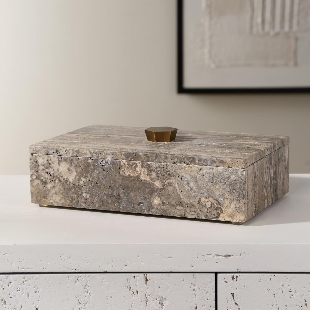 Need An Elegant Hide Away To Stash Small Items? This Gray Unfilled Travertine Box With Bronze Handle And Lift-off Lid Is The Perfect Spot. Because It Is A Natural Stone, Each Piece Of Travertine Is Unique.