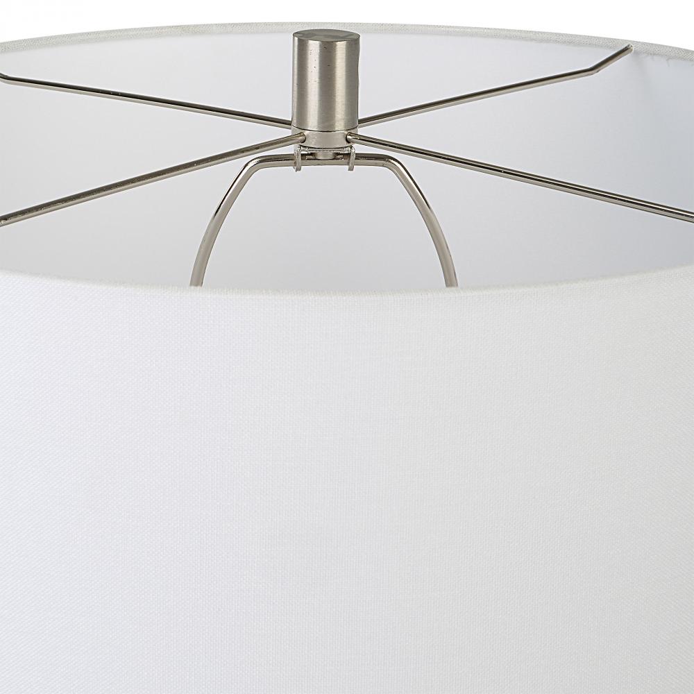 With Its Casual Ceramic Build and Chalk White Matte Finish, The Styling Possibilities for This Table Lamp Are Virtually Endless. All Steel Details Are Finished in Brushed Nickel. The Lamp is Paired with A Hardback Drum Shade Covered in A White Fabric.