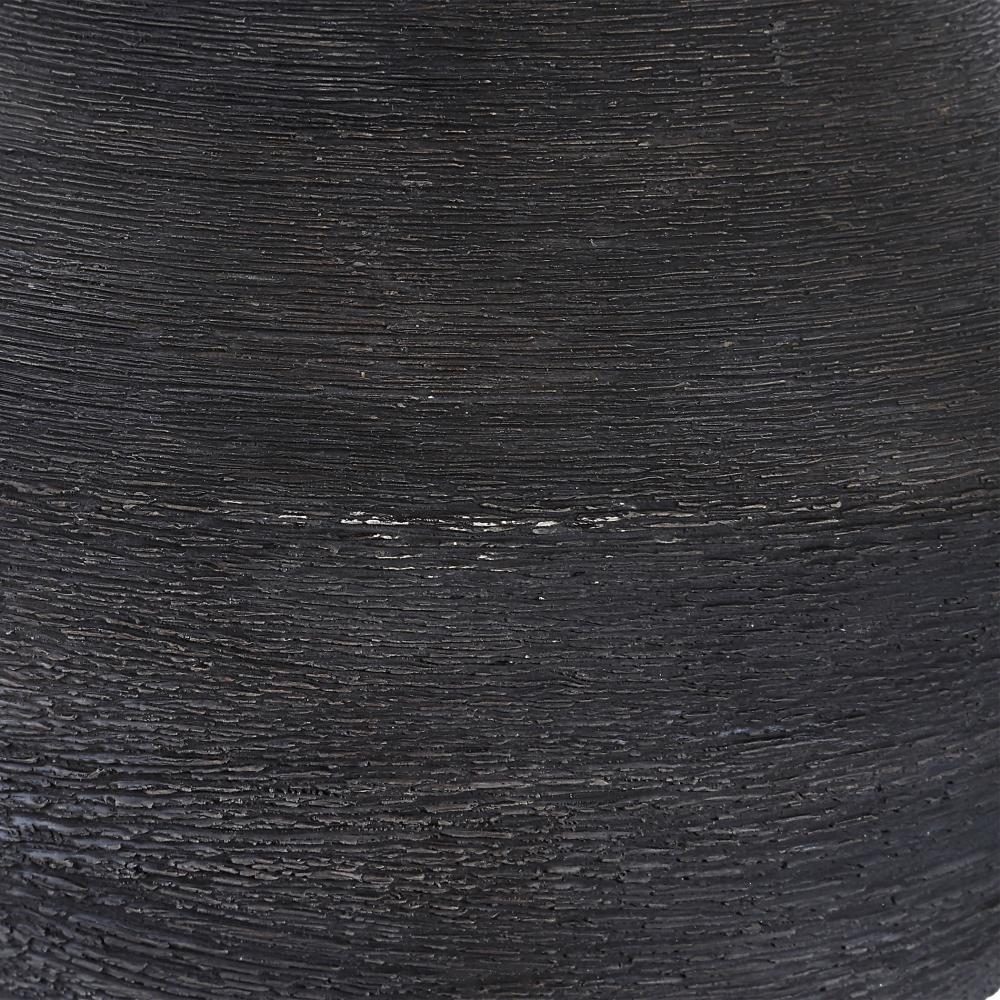 This Ceramic Table Lamp Features A Heavy Horizontal Texture Finished In A Rustic Dark Charcoal Glaze, Accented With Plated Brass Details. A Round Hardback Drum Shade Finished In A Casual Off-white Linen Fabric Completes The Piece.