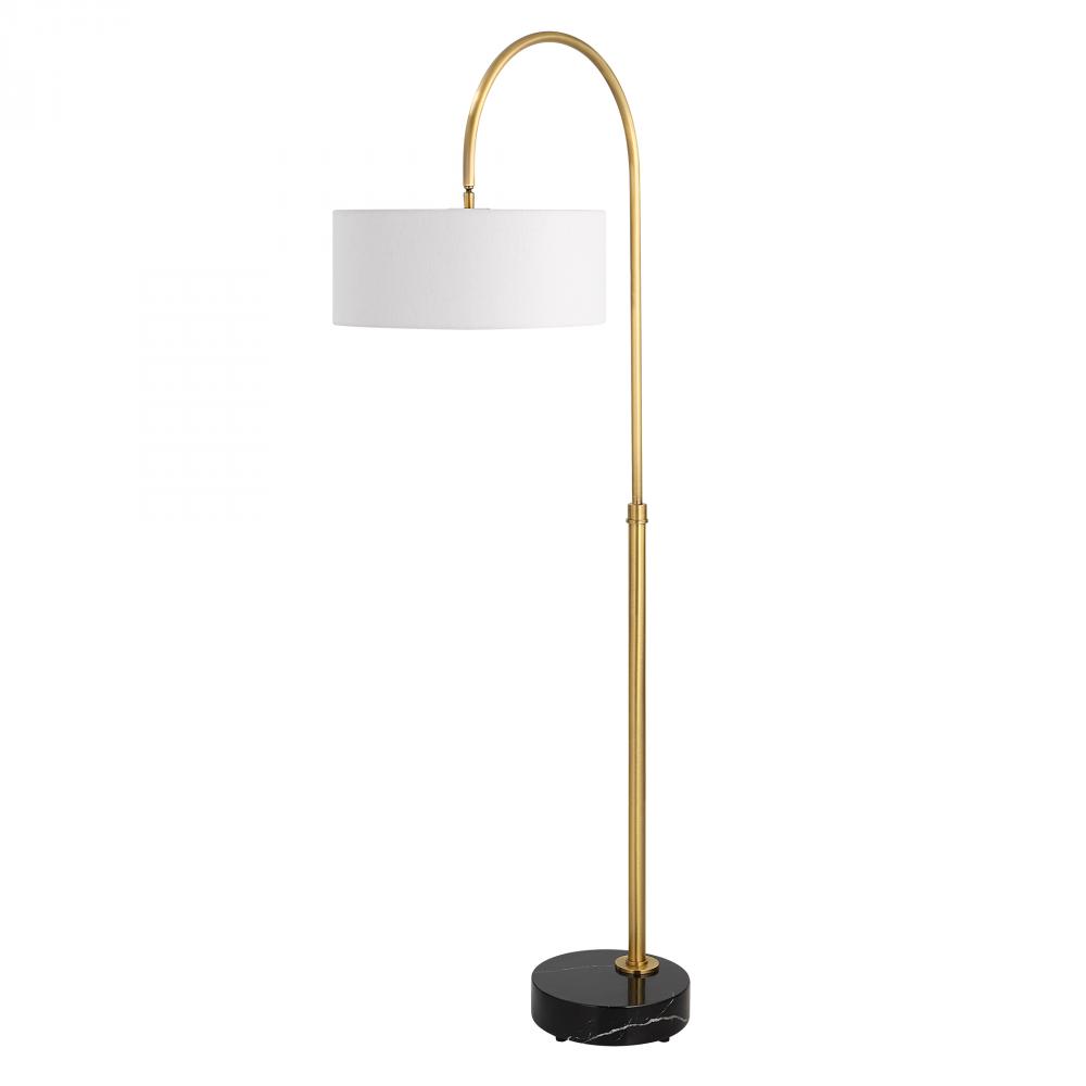 This Classic Arc Floor Lamp is Crafted From Iron Finished in A Plated Antique Brushed Brass, Accented By A Thick Black Marble Foot with Natural Veining. The Suspended Round Hardback Shade is Covered in An White Linen Fabric, Attached to A Pivoting Neck Allowing The Shade to Be Placed At An Angle If Desired.