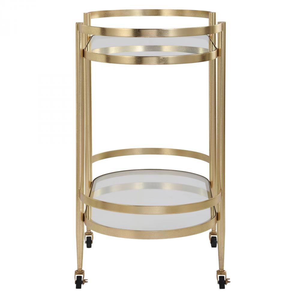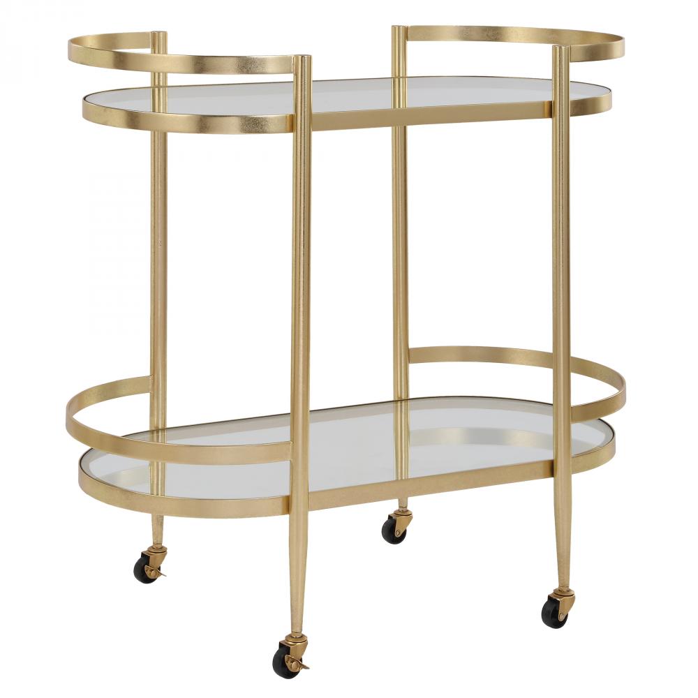 A Refined Serving Cart, Forged With A Beautiful Soft Gold Leaf Finish Made Completely From Iron. The Two Tray Style Glass Shelves Allow The Beauty Of Your Glassware And Bottles To Shine Through. Complete With Rolling And Locking Casters.
