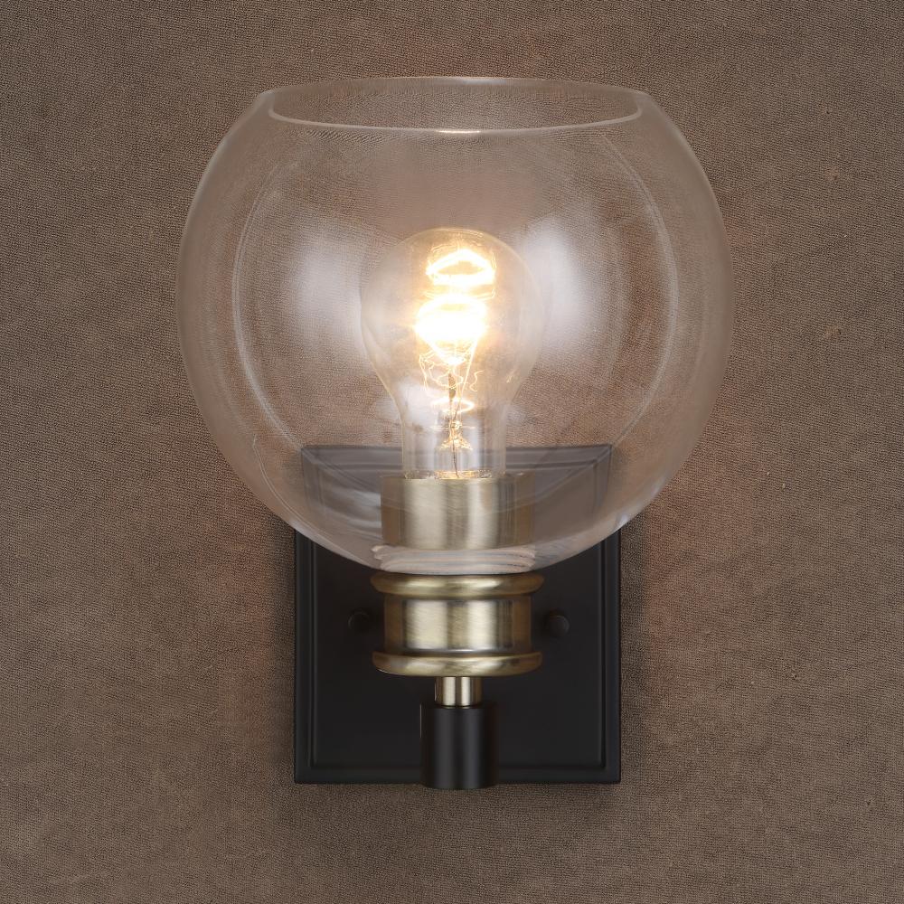 Timeless Lines Make This 1 Lt. Sconce An Understated Classic. Finished in A Combination of Matte Black & Plated Antique Brass Then Topped with Sparkling Clear Round Glass Shade. 1-60 Watt Max, Edison Socket. Bulbs Not Included.