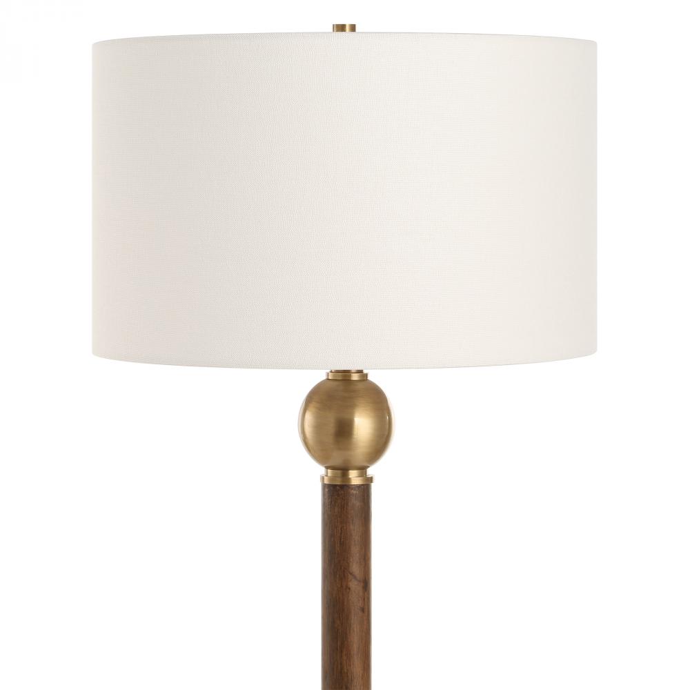 Infusing Your Space With Rustic Charm And A Hint Of Sophistication, The Keros Floor Lamp Features A Dark Oak Wood Base Paired With Brass Plated Details. The Round Hardback Drum Shade Is Covered In An Off-white Linen Fabric.