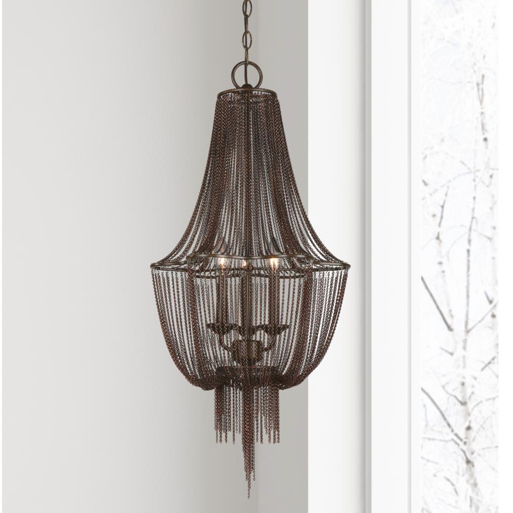 Draped Jewelry Chain Finished in A Dark Oil Rubbed Bronze with Gold & Copper Highlights. 3-60 Watt Max, Candelabra Sockets. Bulbs Not Included. Supplied with 15' Wire & 7' Chain for Adjustable Installation.