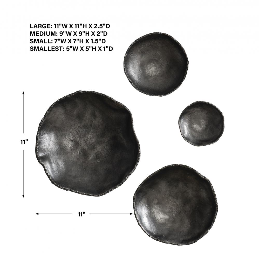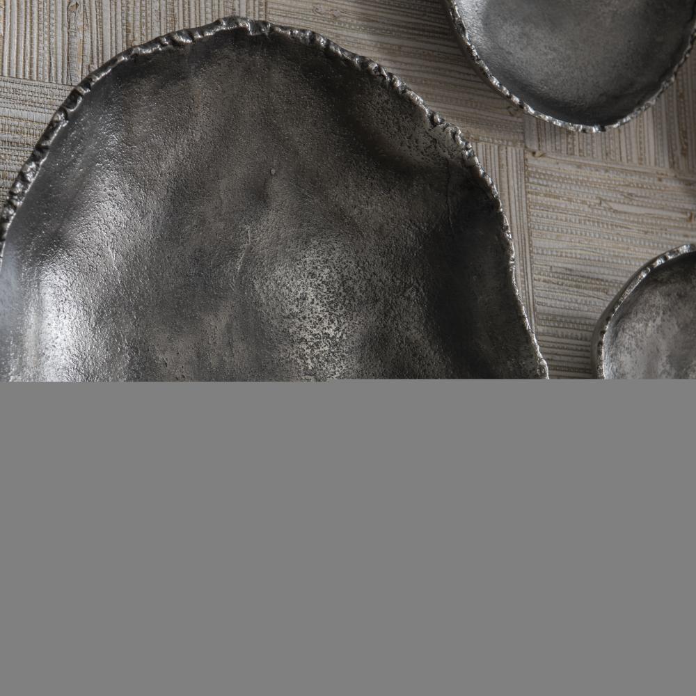 Handcrafted From Aluminum, These Metal Wall Bowls Feature Noticeable Textural Elements with Organic Edge Details and Are Finished in Antiqued Nickel. May Be Hung on A Wall with Keyhole Hangers, or Displayed As Tabletop Accessories. Sizes: Sm-5x5x1, Med-7x7x2, Lg-9x9x2, XL-11x11x3