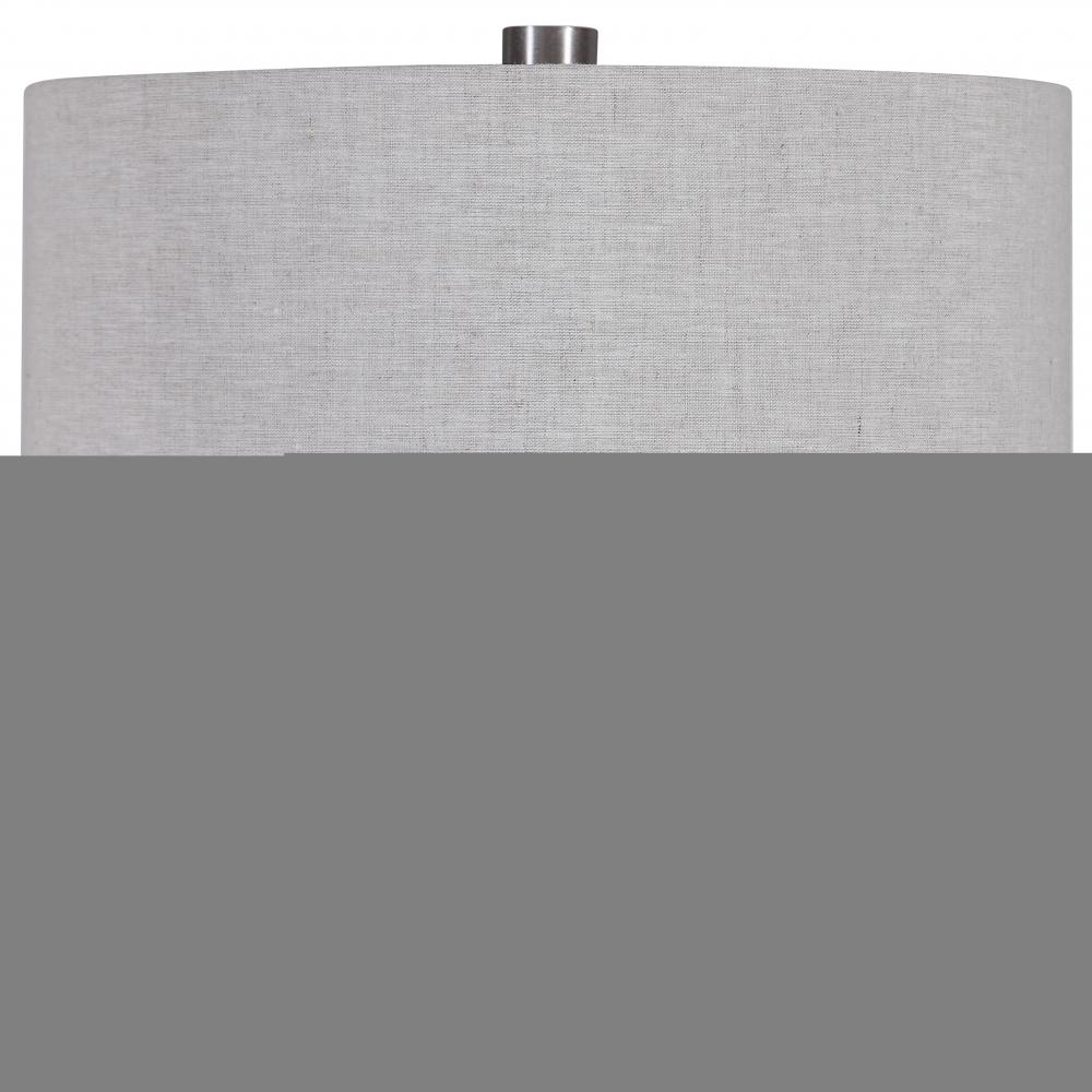 This Table Lamp Features A Ceramic Base Finished in An Earthy Terracotta Rust That Transitions Into A Crackled Green-gray Glaze, Accented with Brushed Nickel Plated Details and A Thick Crystal Foot. The Hardback Drum Shade is A Warm Gray Linen Fabric with Natural Slubbing.