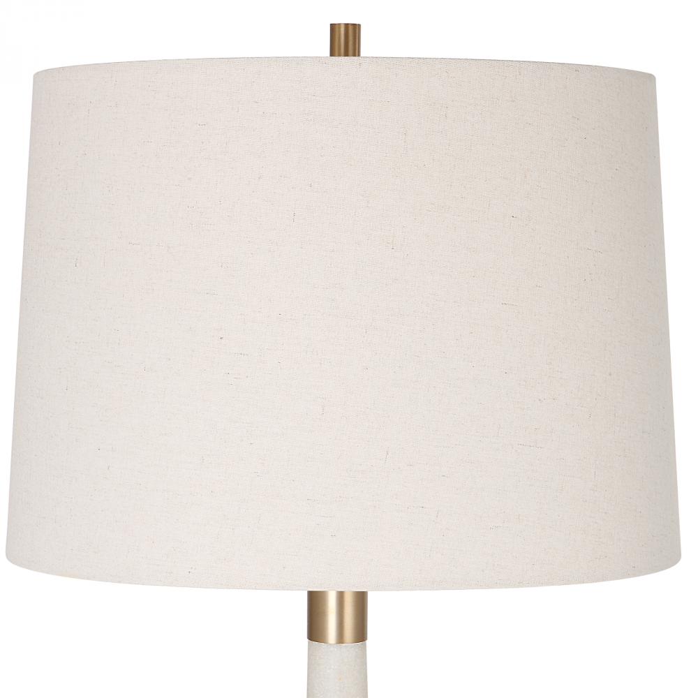 This Table Lamp Adds An Air of Elegance and Sophistication to Any Space. The Body of The Lamp is Crafted From Ivory Man-made Stone That Accurately Replicates The Look of Thassos Marble and is Accented By Iron Details Finished in Brushed Brass. The Tapered Hardback Drum Shade is Covered in A Casual Light Khaki Fabric with Natural Slubbing.
