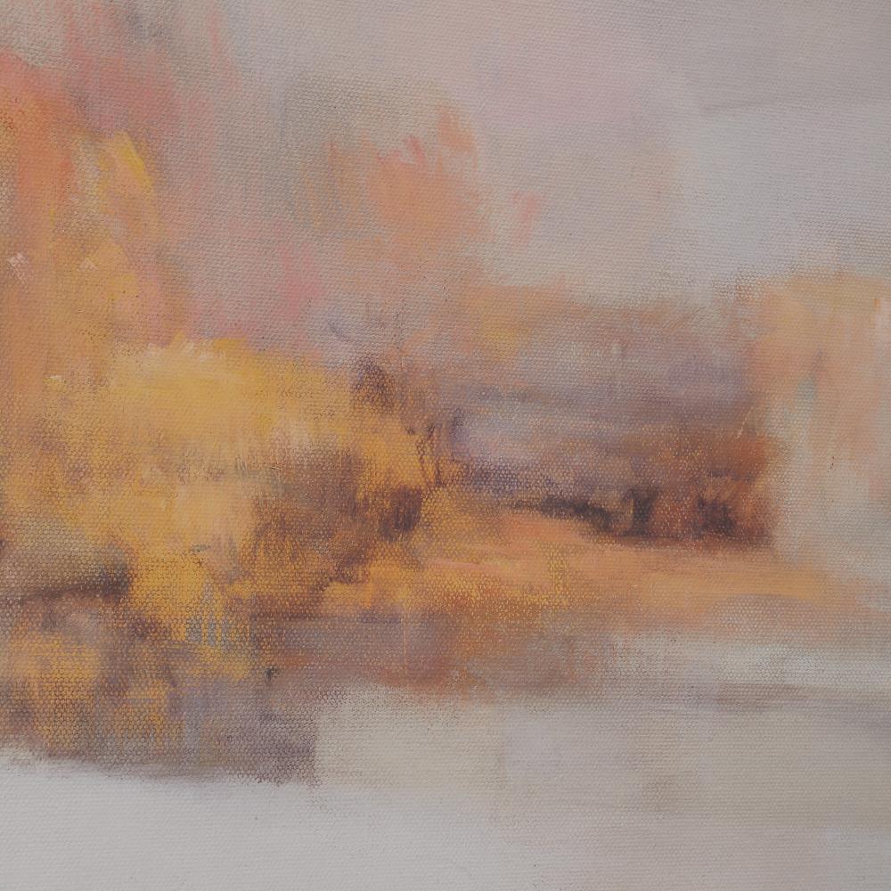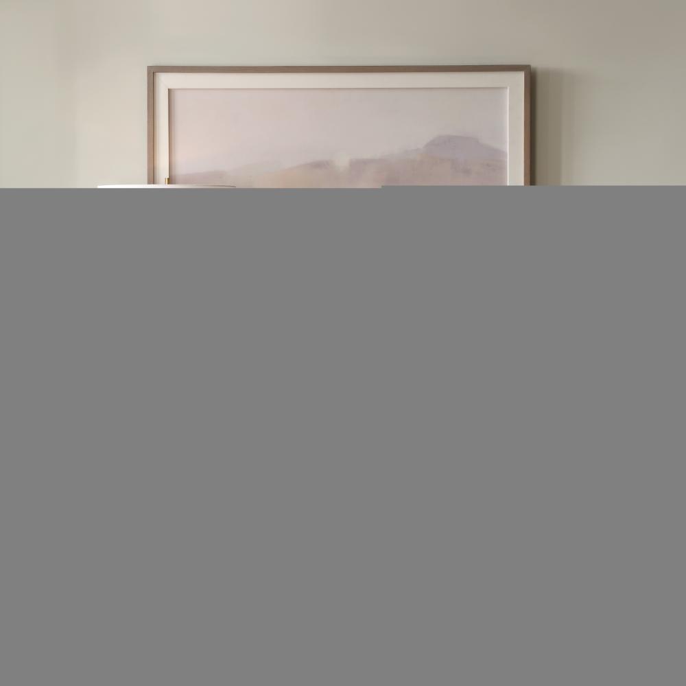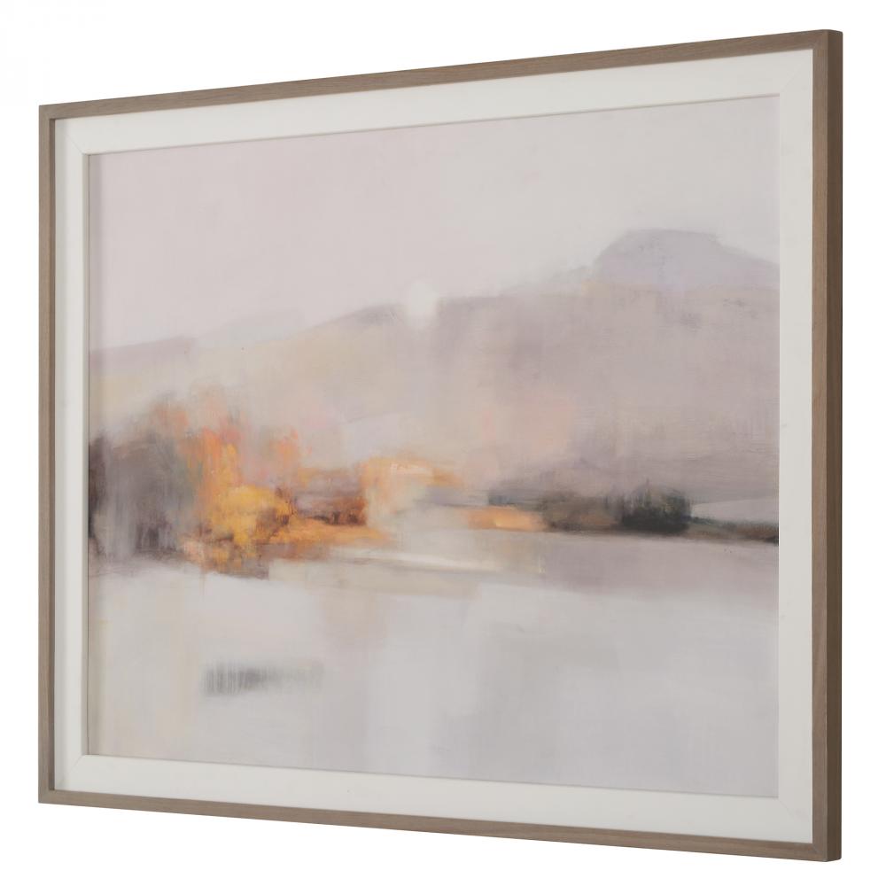 Memory Of The West Framed Print Is A Captivating Landscape Showcasing The Natural Beauty Of A Sunset. The Print Casts A Warm Reflection Of Various Shades Of Orange Paired With Lavender Accents And Is Accentuated By A White Linen Liner. A Pine Wood Frame Finished In A Light Gray Stain With White Wash Accents Completes The Piece. Artwork By Julia Purinton.