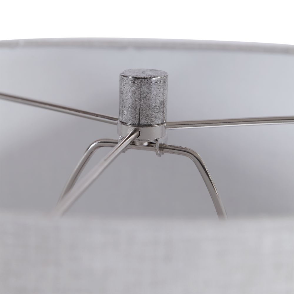 Finished in A Charcoal Glaze with Etched Texture, This Table Lamp Adds A Casual Yet Contemporary Feel to A Space. The Round Ceramic Base is Complemented By Brushed Nickel Hardware. A Round Hardback Drum Shade in Oatmeal Linen Completes The Piece.
