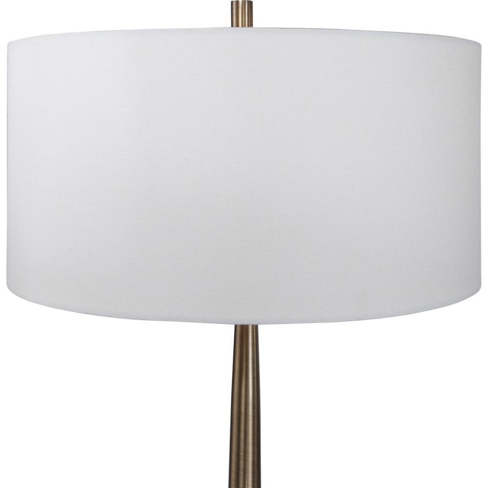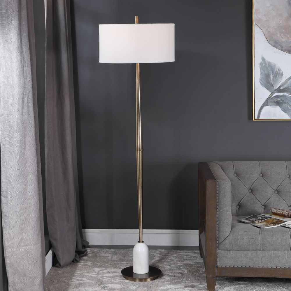 Transitional in Design, This Floor Lamp Has A Tapered Base Finished in A Plated Antique Brass, Accented with A Polished White Marble Detail. The Piece Has A White Linen Hardback Drum Shade.