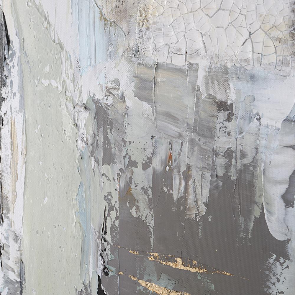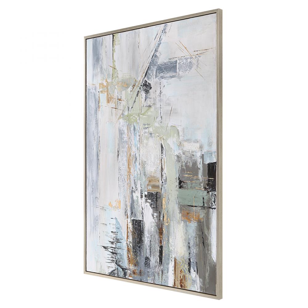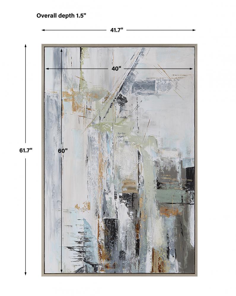 The Natural Springs Hand Painted Artwork Marries Modern Angular Elements with A Cool, Muted Color Palette. The Soft Sage, Blue, and Neutral Canvas is Accented By Hand Applied Crackle Texture and Subtle Gold Leaf Accents, Encased in A Silver Leaf Gallery Frame. May Be Hung Horizontal or Vertical.