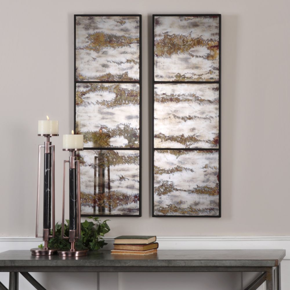 Each Panel Features Three Mirrors with A Heavily Oxidized, Antiqued Mirror in Deep Earth Tones. May Be Hung Horizontal or Vertical.