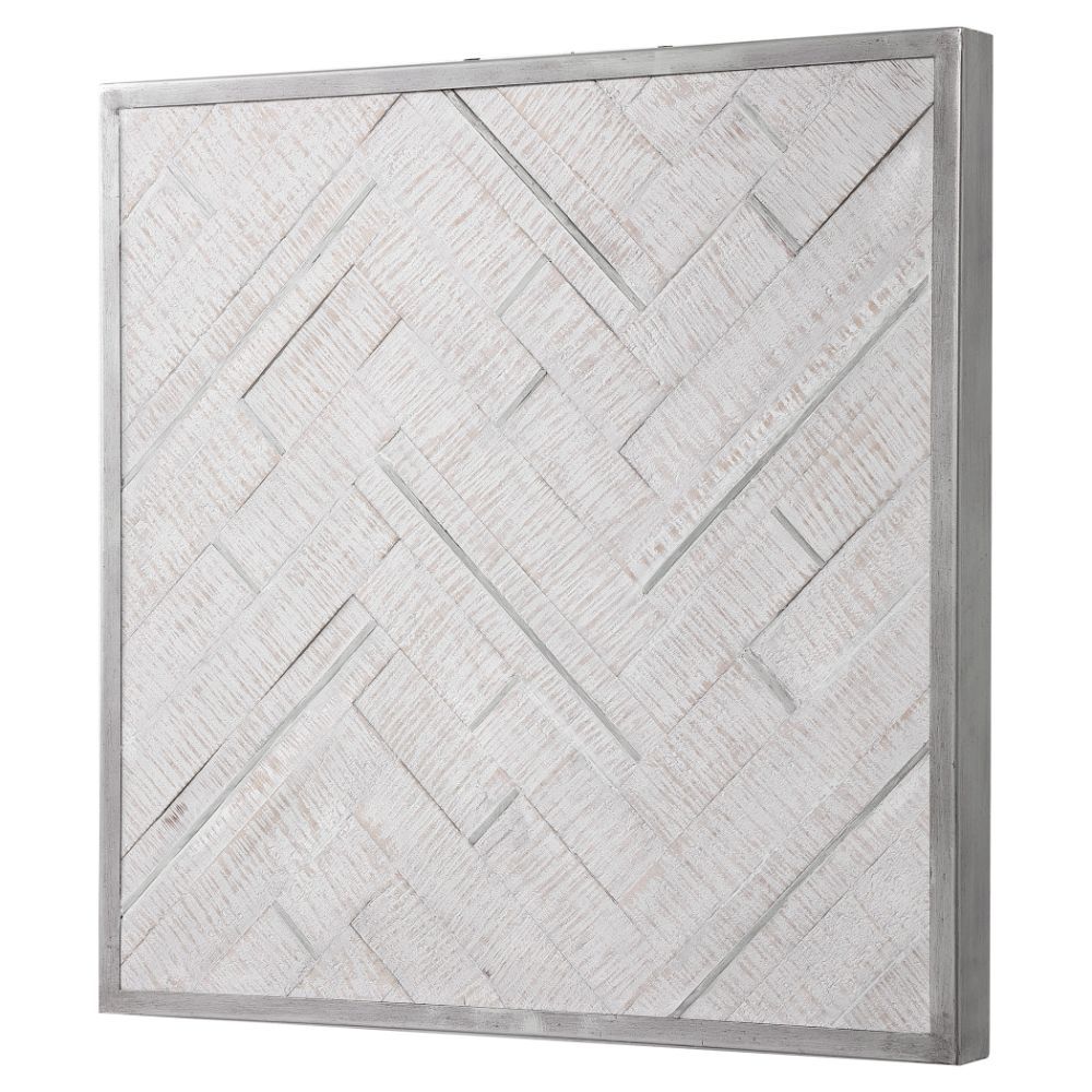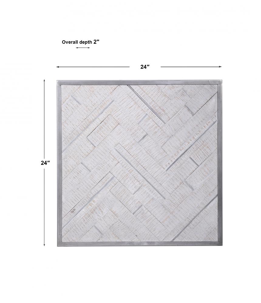 This Wood Wall Panel Personifies Modern Coastal Style with Whitewashed Pine Wood in A Classic Herringbone Pattern Accented By Sleek Silver Bar Inserts. Each Piece is Paired with A Distressed Brushed Silver Frame and May Be Hung Horizontal or Vertical.