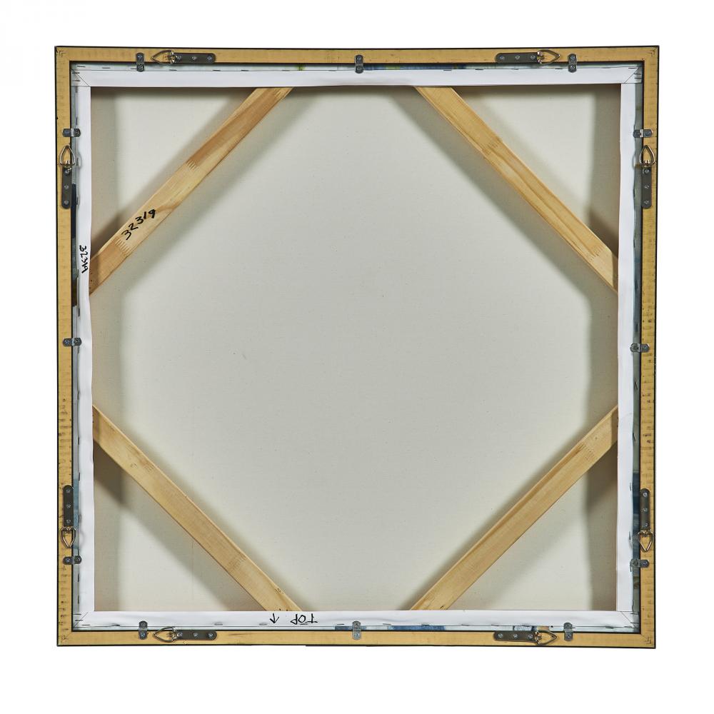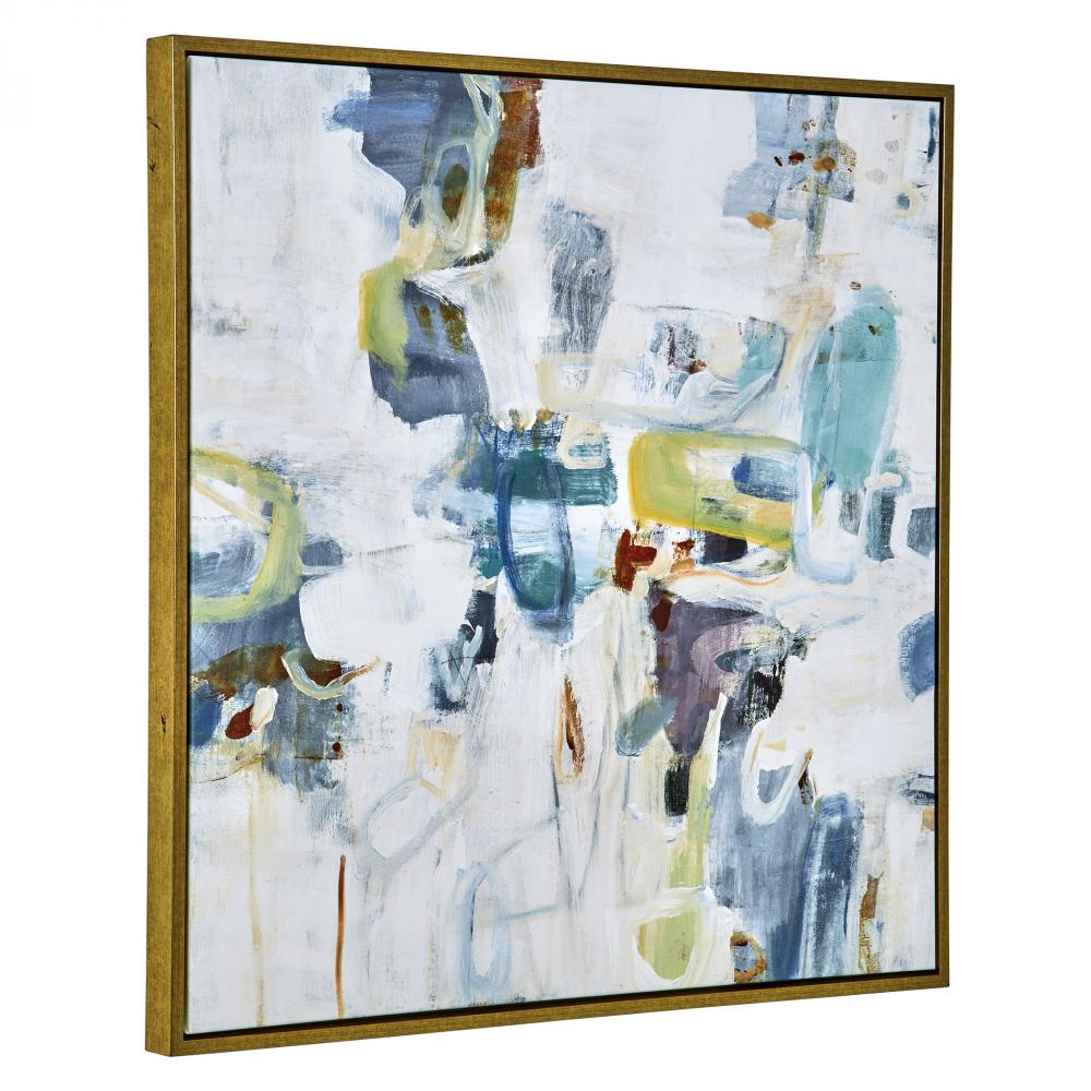 Giclee on Canvas, This Abstract Piece Features Shades of Blue, Tan and Yellow Highlighted with White Accents. A Solid Wood Gallery Frame with Gold Finish Completes The Artwork. May Be Hung Horizontal or Vertical. Each Canvas is Proudly Handcrafted and Printed in The USA. Artwork By Lisa Ridgers.