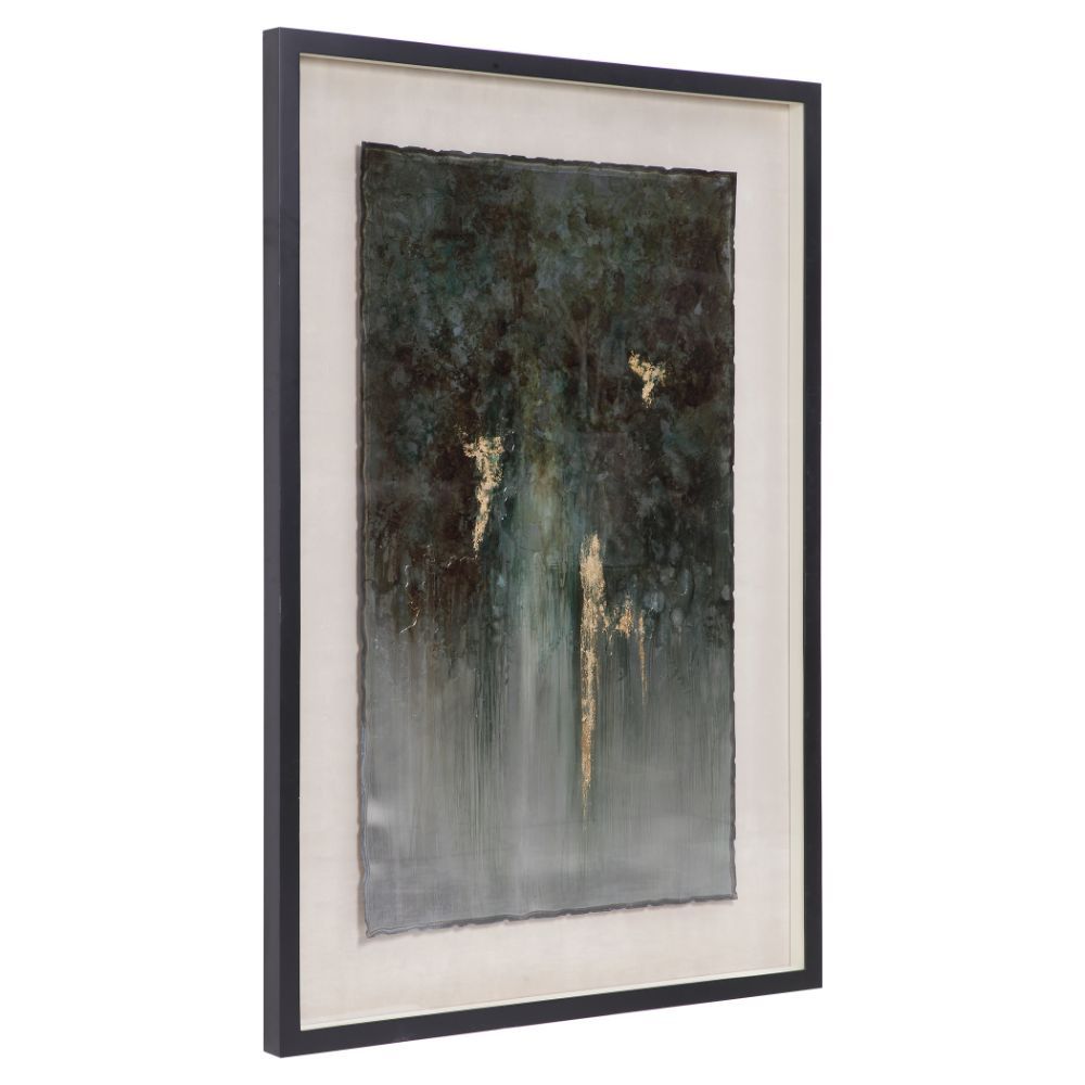 Hand Painted on A Metal Sheet, This Contemporary Artwork Features Shades of Silver and Gold Leaf, Dark Brown, and Green. Each Piece is Placed Under Glass in A Black Shadow Box Style Frame Against A Beige Background. Due to The Handcrafted Nature of This Artwork, Each Piece May Have Subtle Differences.