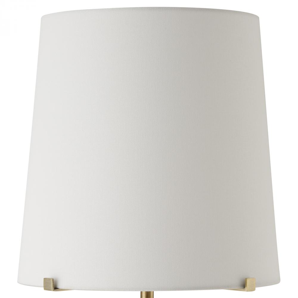 The Sepia Buffet Lamp Showcases A Brown Marble Cylinder Base Accented With Plated Antique Brass Details. The Tapered Round Hardback Shade Is A Crisp White Linen Fabric, Held In Place By Brass Plated Steel Arms.