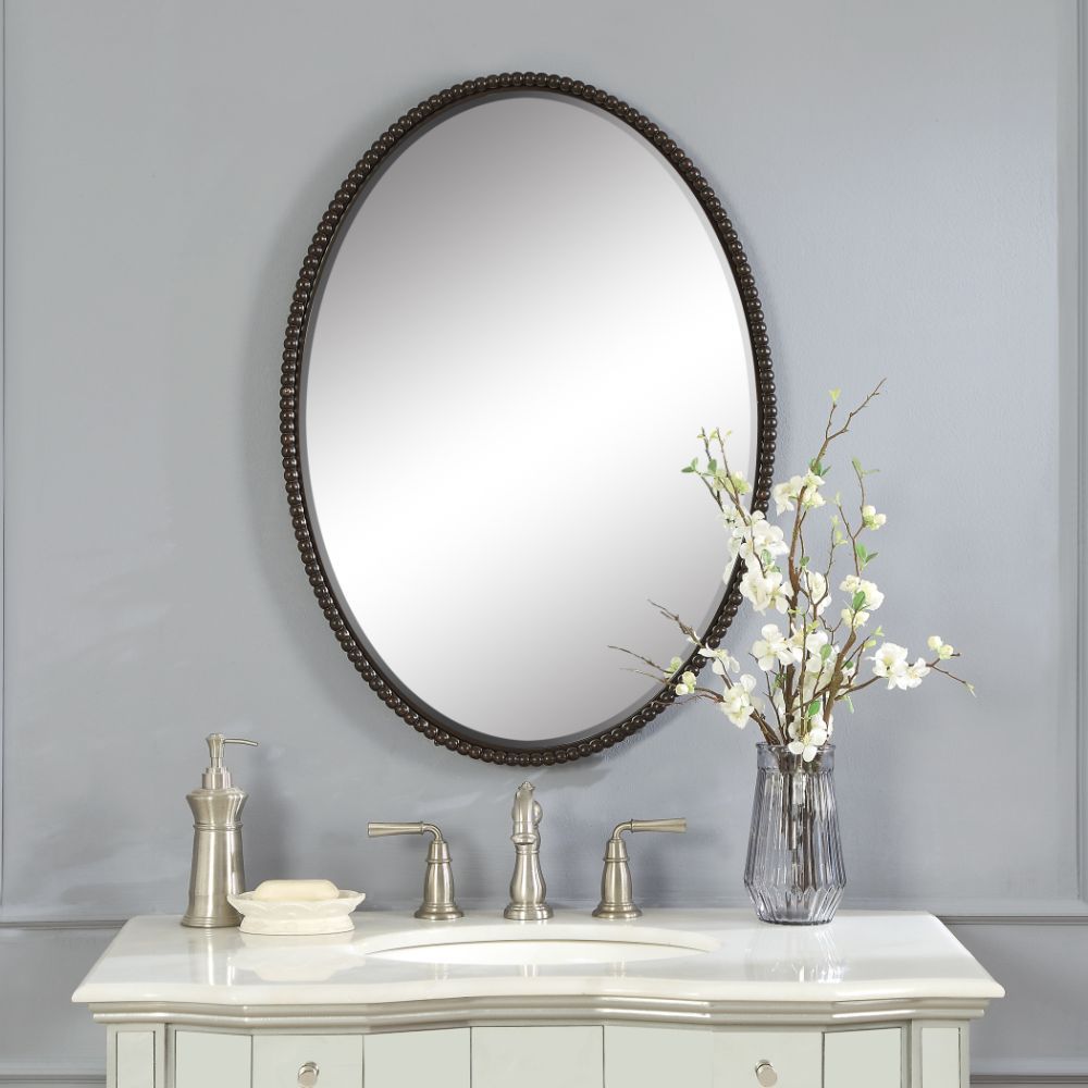 This Oval Mirror Features A Beaded Frame Made of Hand Forged Metal Finished in Lightly Distressed, Oil Rubbed Bronze. Mirror is Beveled.