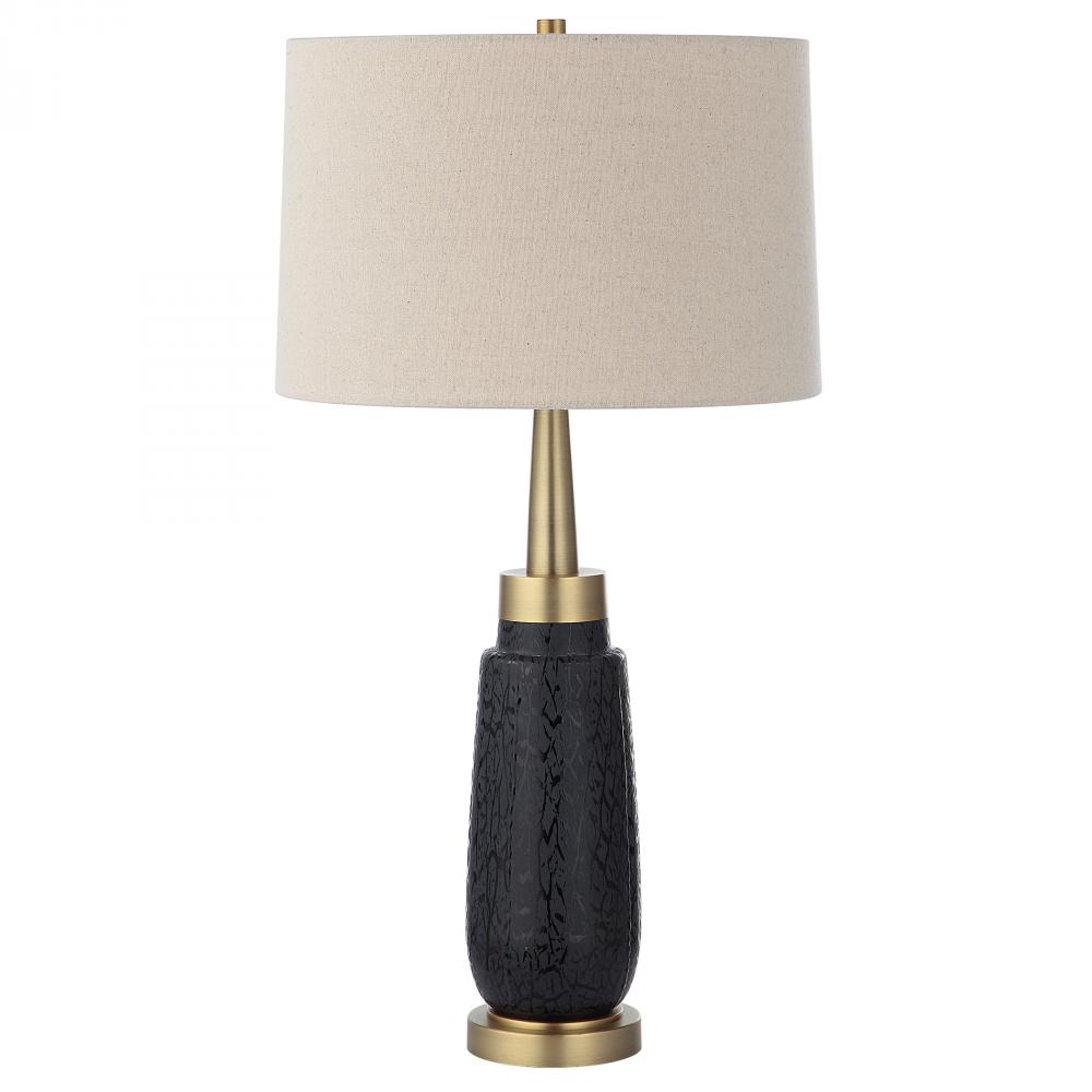 The Spyglass Table Lamp Features A Matte Black Glass Base with Polished Black Woodgrain-like Etching, Paired with Lightly Antiqued Brass Plated Foot and Hardware. The Round Hardback Shade is Covered in A Light Beige Linen Fabric.