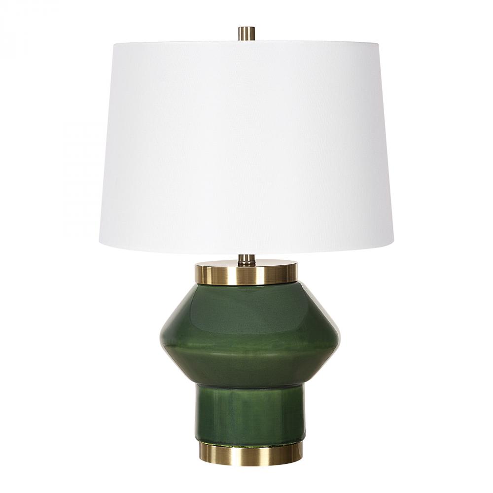 The Tayson Table Lamp Showcases A Jade Green Ceramic Base Accented With Antique Brass Plated Details, Blending Striking Design With Contemporary Elegance. The Tapered Hardback Shade Is Covered In A Crisp White Linen Fabric.