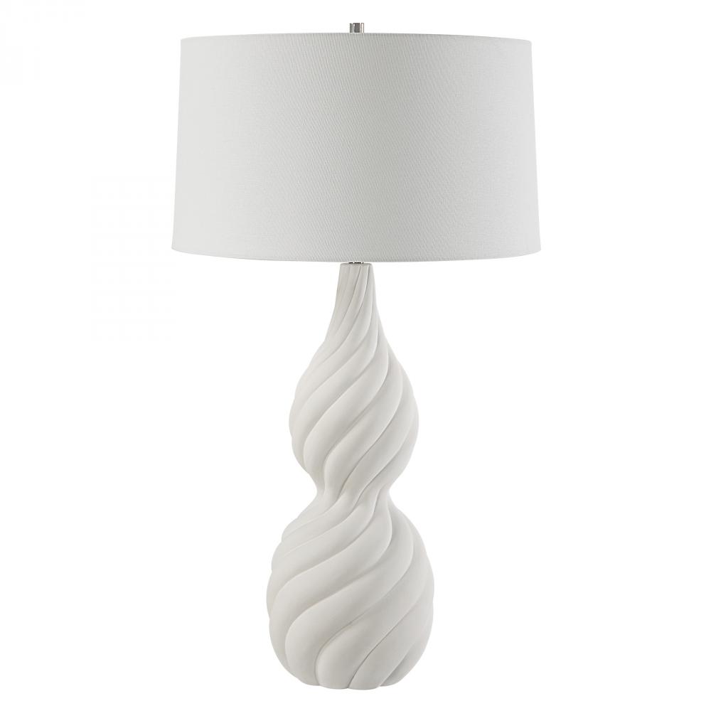 This Ceramic Table Lamp Features A 3-dimensional Twisted Swirl Pattern Finished in A Textured Chalk White Glaze Accented with Polished Nickel Details. The Tapered Round Shade is Covered in A Crisp White Linen Fabric.
