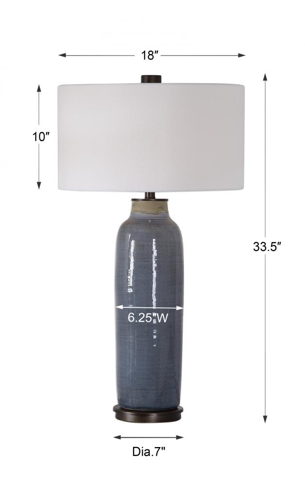 This Table Lamp Lends A Touch of Old-world, Handcrafted Style with This Ceramic Base Finished in A Distressed Slate Blue Glaze Accented with Oil Rubbed Bronze Accents. The Round Hardback Drum Shade is A White Linen Fabric. Due to The Nature of Fired Glazes on Ceramic Lamps, Finishes Will Vary Slightly.