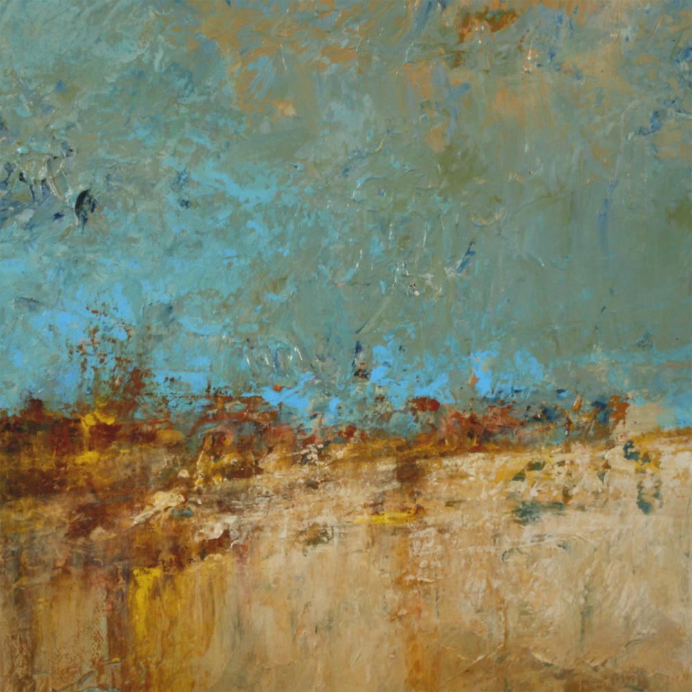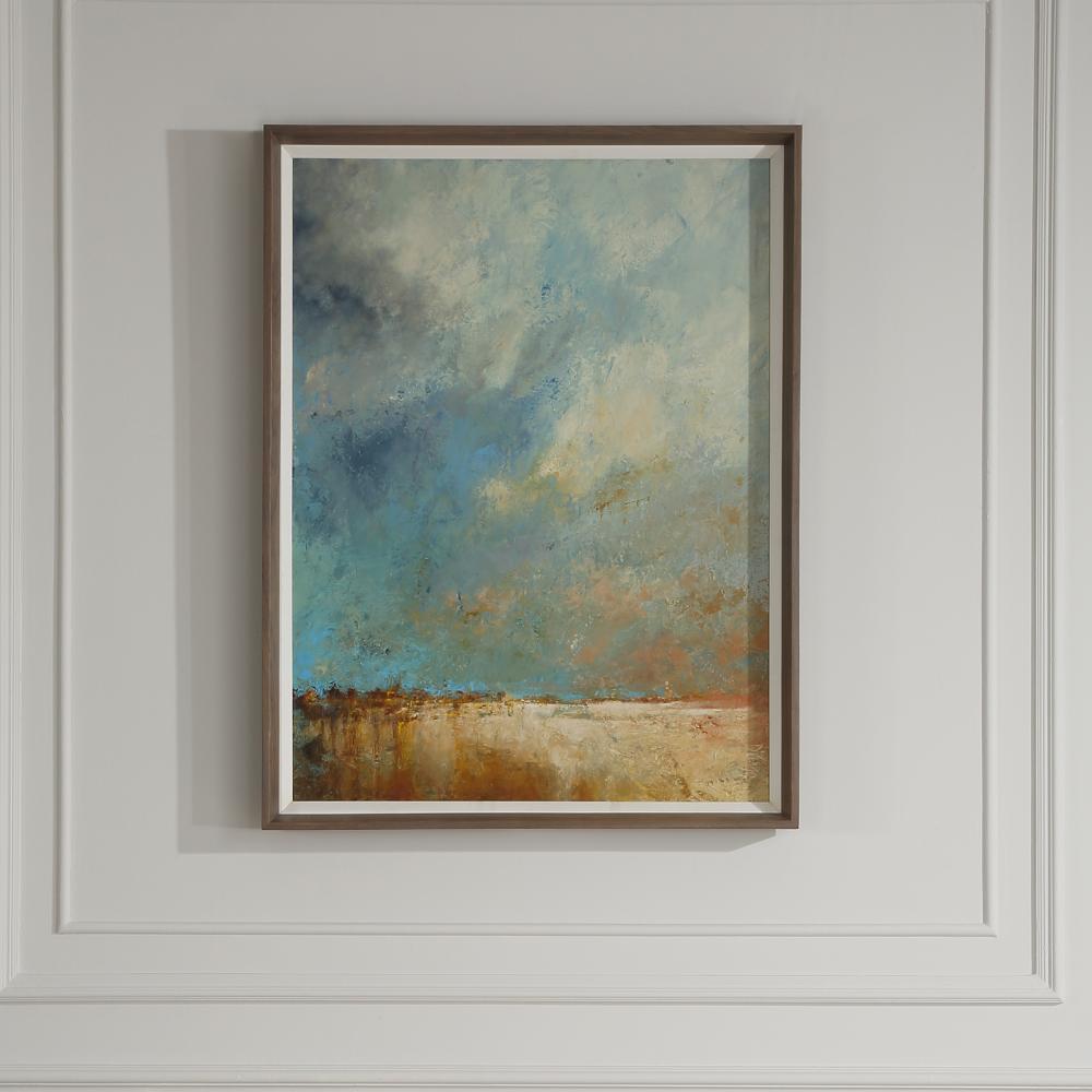 Vista Grande Framed Print Showcases A Dusty Desertscape Under A Stunning Blue Sky With Dreamy Clouds. Beautifully Surrounded By A Dark Walnut Frame With A Gray Wash And Accented By A White Linen Liner. Artwork By Dina D'Argo.
