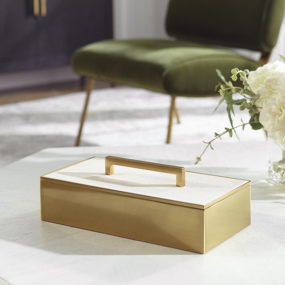 A Classic Silhouette with Modern Touches, This Metal Box is Finished in A Classic Brass and Covered with A Lift-off Lid Finished in A White Faux Shagreen with Brass Handle.