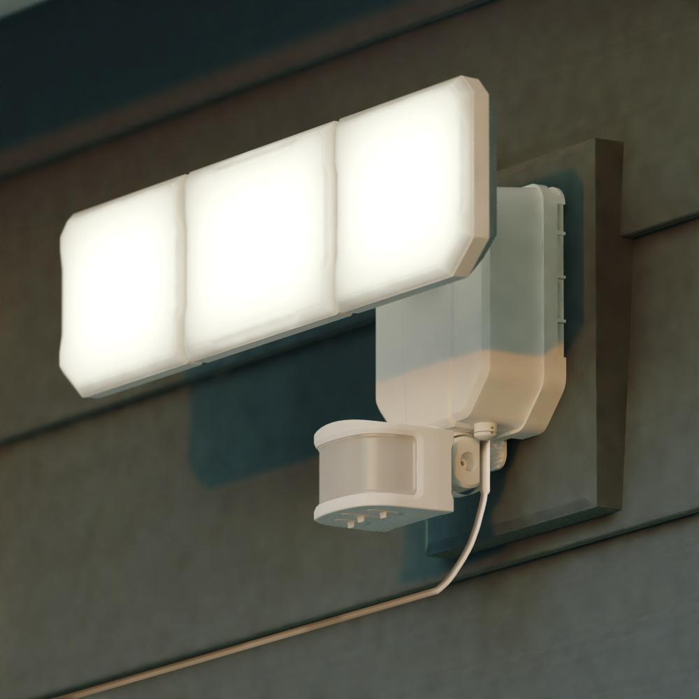 This 3-light integrated LED solar outdoor motion sensor security light provides dual-level lighting: ambient 2700K low-level lighting overnight and 5000K full brightness high level when motion is detected. The light heads and sensor are fully adjustable and automatically deliver 2500 lumens to illuminate your home’s exterior with warm ambient light at dusk, then instantly brighten when motion is detected. The included solar panel is equipped with a 16 foot connecting wire to allow for positioning in maximum sunlight for solar power or optional battery backup power with 3 x 1.5V C-Type Alkaline batteries (not included) keeps your lights powered no matter the weather. Customize your lighting options with 2 modes of operation plus adjustable motion sensor sensitivity. Suitable for wall or eave mounting with a wide 240 degree detection area and up to 50 feet. This Dualux security flood light expands the functionality, safety, and security of your home’s outdoor spaces with bright, reliable light when and where it’s needed.