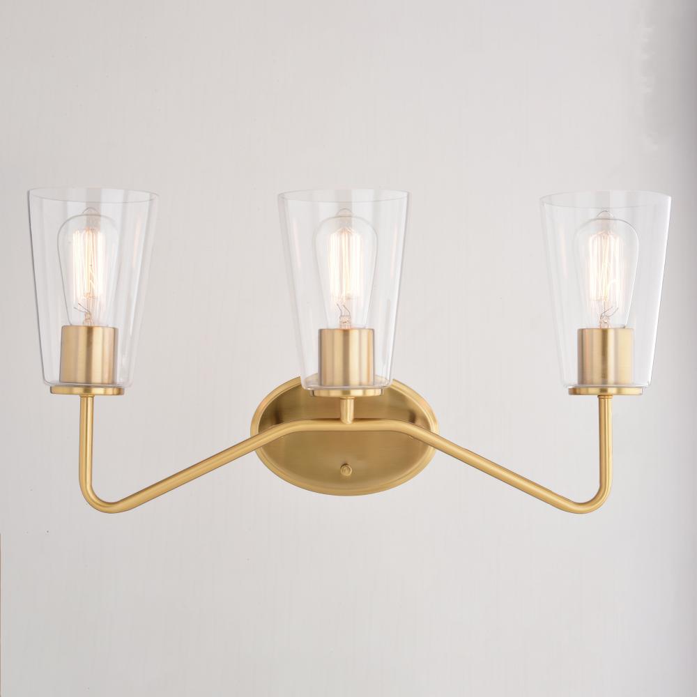 The Beverly collection provides a modern take on classic elegance. Uniquely curved arms in a muted brass finish support clear tapered glass strongly anchored in place. Round matte black discs hold the glass creating a gentle, inviting aesthetic. This bathroom light is perfect over medium vanities or as a pair over double sinks. Add this versatile 3 light vanity to any bathroom for the ultimate addition of transitional style.