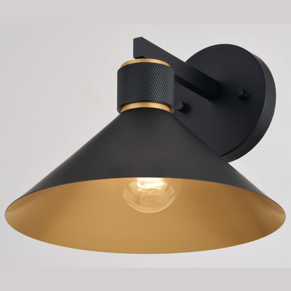 The combination of matte black and gold finishes brings contemporary style to the Dunbar collection. A tapered metal shade provides downward dark sky lighting and features a textured knurled ring accent. Ideal for use on outdoor patios, entryways, and garages. Equally suited for indoor use such as the bath, hallway, or kitchen spaces.