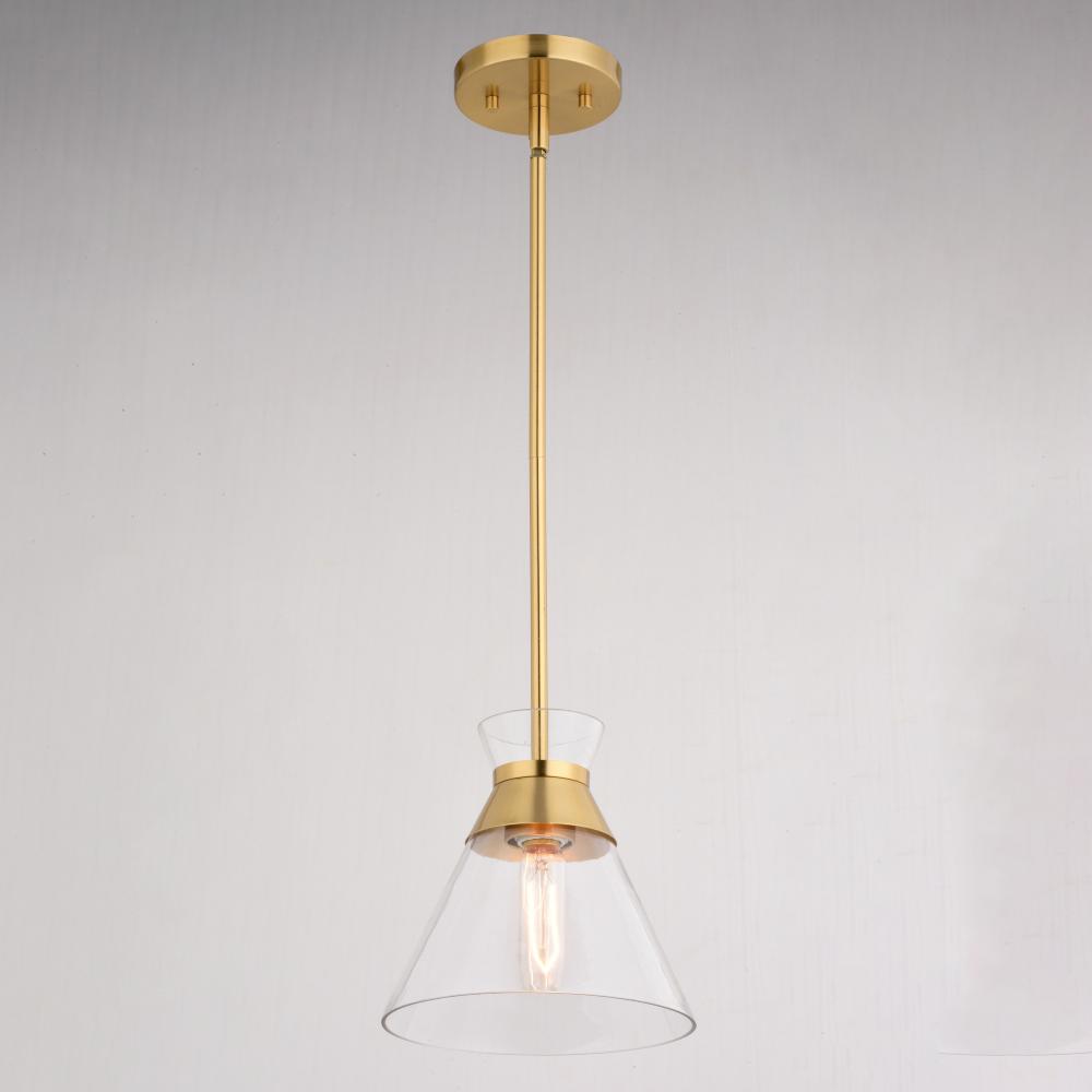 Indulge in mid-century modern charm with the Harper 1 Light Pendant. Its sleek, bowtie-inspired design and natural brass finish bring a touch of warmth and sophistication to your kitchen island or eat-in space. The clear glass shade beautifully showcases your choice of bulb, creating a captivating focal point.