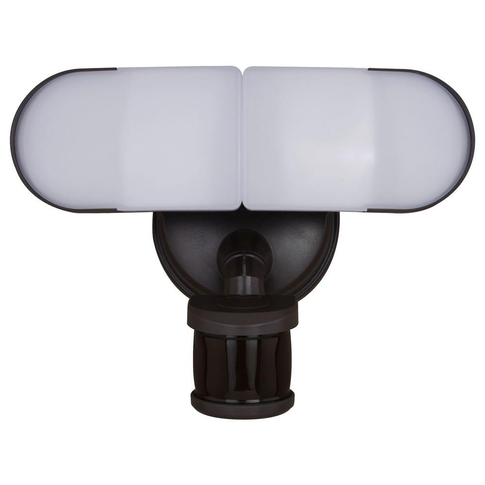 The bronze 2-light Lambda LED outdoor motion sensor security flood light provides the ability to connect multiple security lights into a sync group, so if one in the group detects motion, all will engage with 5000K high level bright light. The modern light heads are fully adjustable and deliver 2,600 lumens to keep your home's exterior brighter at dusk, dimmer with 2700K at night, and instantly bright 5000K when motion is detected. This sync-able dualux security light expands the functionality, safety, and security of your home's outdoor spaces with bright, reliable light when and where it is needed.