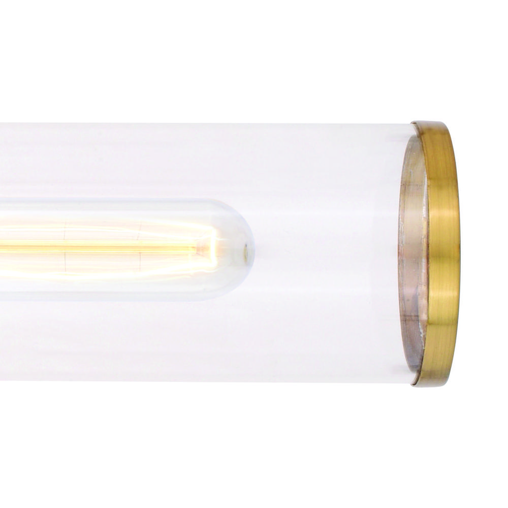 The Levitt sports a handsome look for an industrial loft feel. Clear cylinders of glass extend along a circular satin brass wall plate. The glass ends are accented with a touch of metallic shine. Mount these versatile fixtures horizontally or vertically for the ideal look. The Levitt looks best when paired with a long, tubular bulb. Add this wall light to your trendy bath, hallway or any other walls in your home.
