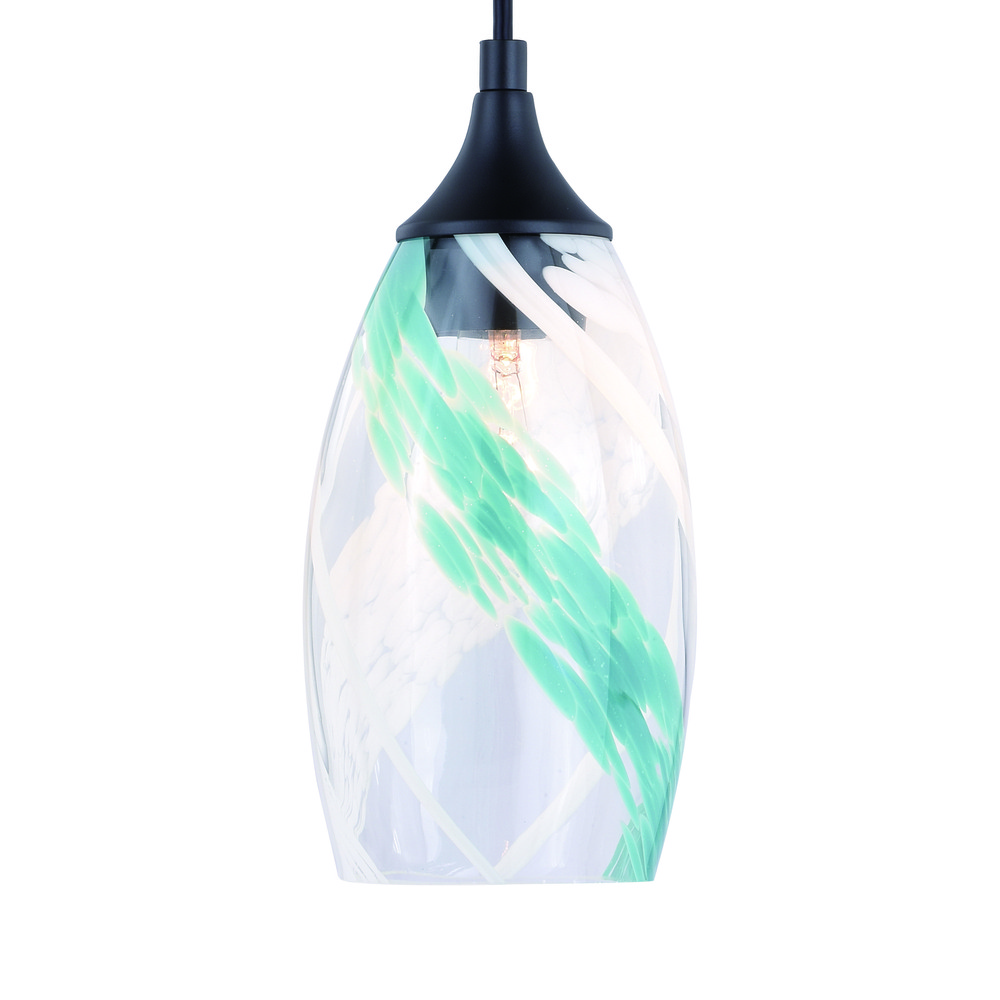 Beauty and pizzazz come together in this stunning addition to the Milano art glass collection. Artfully designed with blue and white painterly swirl, this ceiling mount pendant light features an oil rubbed bronze finish. Combine that with a vintage Edison style filament bulb to complete the look. Install this mini pendant individually or in a group; ideal for kitchens, dining areas, or bar areas.