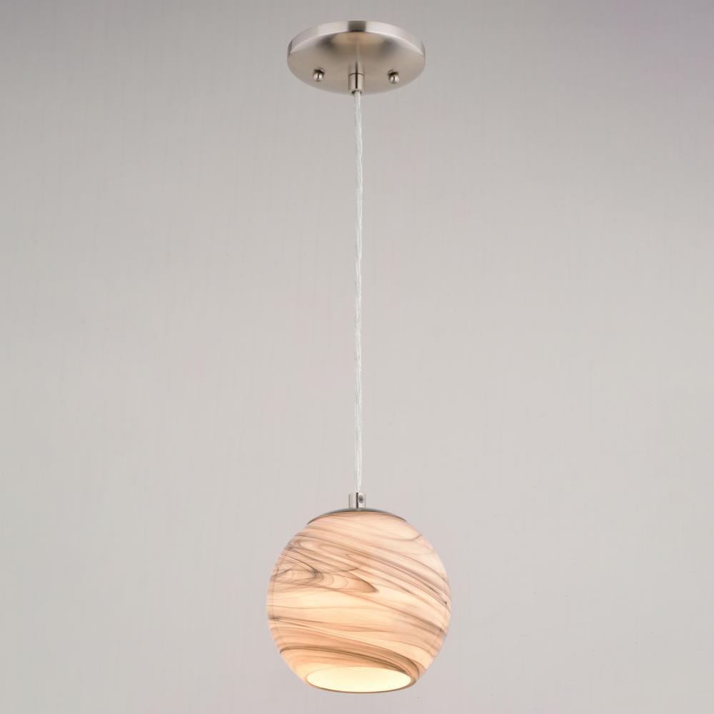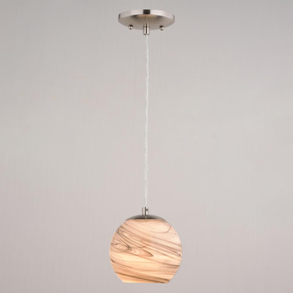The Milano collection of art glass mini pendant lights feature hand-blown glass which gracefully blend into almost any decor. Because each glass is handcrafted utilizing century-old techniques, no two pieces are identical. The marble swirl colored glass has tones of gray and silver in a rounded globe shape. Accented in an artistic satin nickel finish with matching silver cord which can be cut to size to adjust the hanging height. Install this mini pendant individually or in a grouping; ideal for kitchens, dining areas, or bar areas.